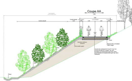 Op de begane grond loopt de vier meter brede cyclostrade grotendeels door bestaande taluds, waar bermen van vijf meter werden uitgegraven. In totaal werd 40.000 m³ grond verwijderd en hergebruikt op de werf.