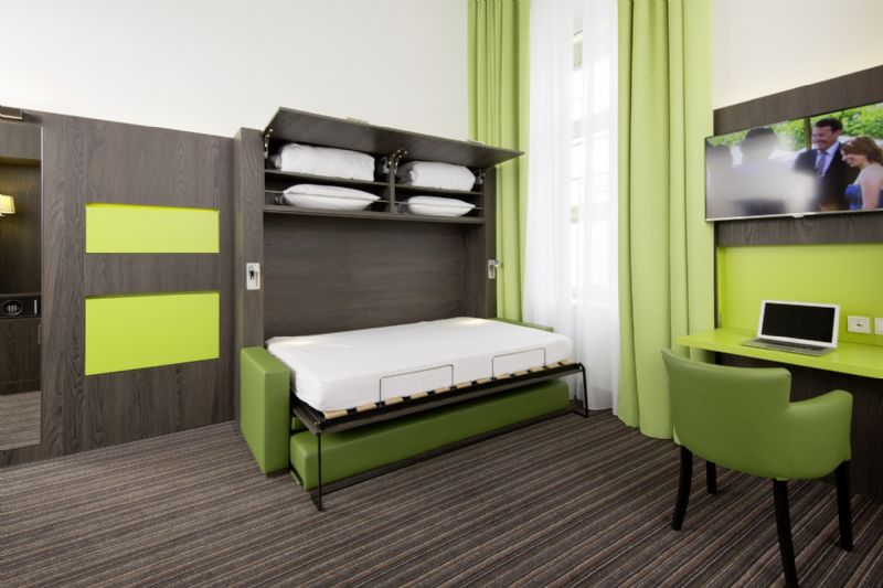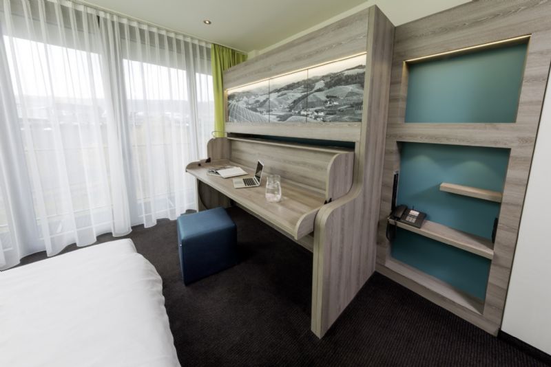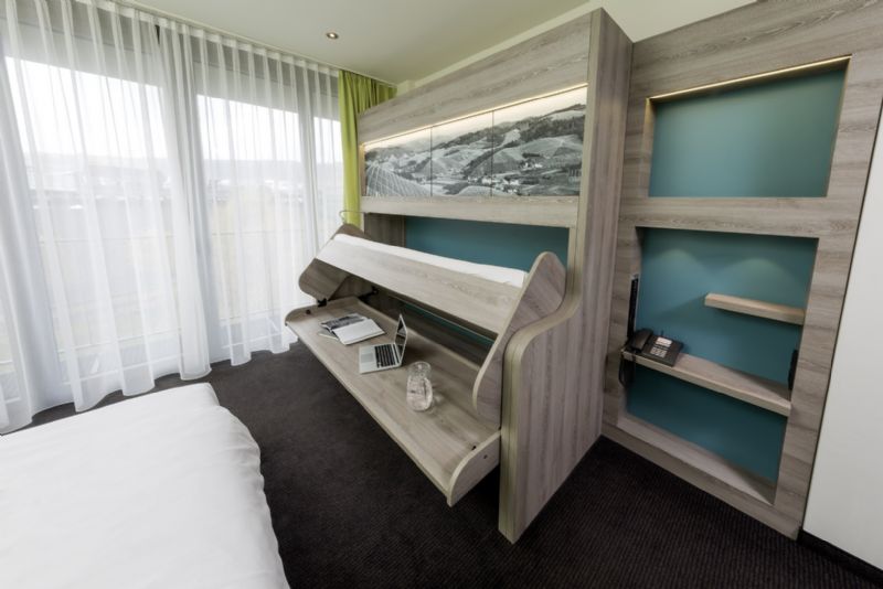 Flexibiliteit en plaatsbesparing zijn slechts enkele van de vele elementen waarover interieurarchitecten zich het hoofd moeten breken. In dat opzicht overtuigen meubels die uitgerust zijn met het Tavoletto- en Teleletto 2-beslag van Häfele door hun functionaliteit en weldoordacht design. Hun toepassings- en verschijningsvorm worden door de schrijnwerker of door de meubelindustrie flexibel en individueel aangepast aan de inrichting/vormgeving van elk hotel.