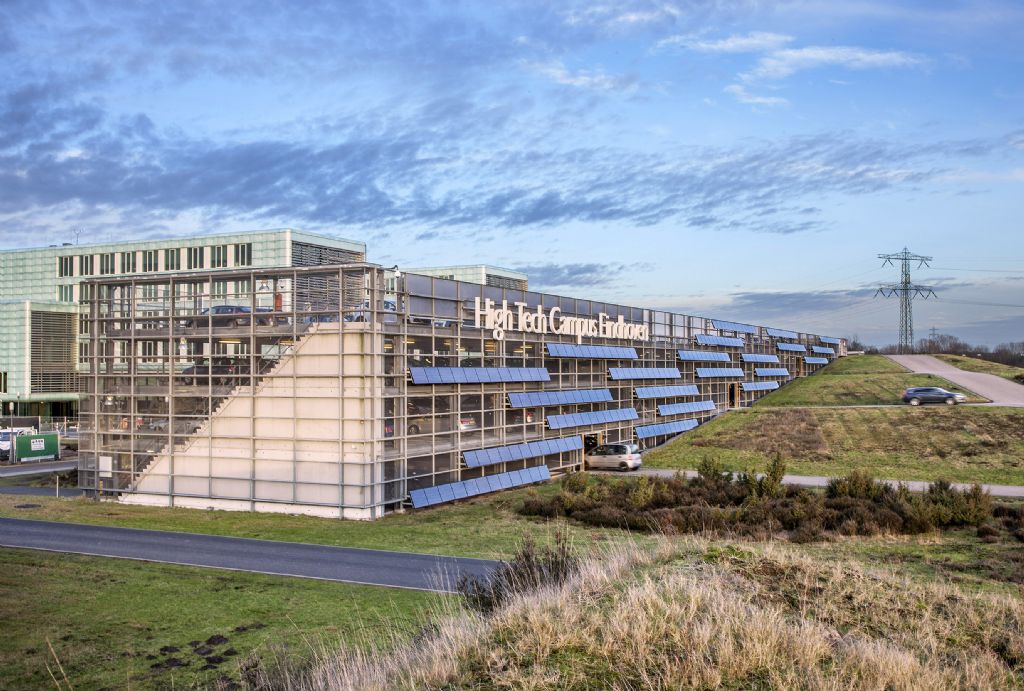 'De slimste km² in Nederland.' Zo betitelt de High Tech Campus in Eindhoven zichzelf op haar website. Op het voormalige R&D terrein van Philips zijn inmiddels meer dan 140 bedrijven en instituten en zo’n 10.000 onderzoekers gevestigd. De parkeerdruk is dan ook hoog. Zo hoog dat eind 2016 een nieuwe parkeergarage wordt opgeleverd, zichtbaar vanaf de snelweg A2. Is deze parkeergarage ook hightech te noemen? "Nu ja, hightech is een groot woord, maar slim is het ontwerp zeker!" Het is de reactie van Lucien Verhoeven die als projectadviseur bij HTCE Development bij de bouw betrokken is.