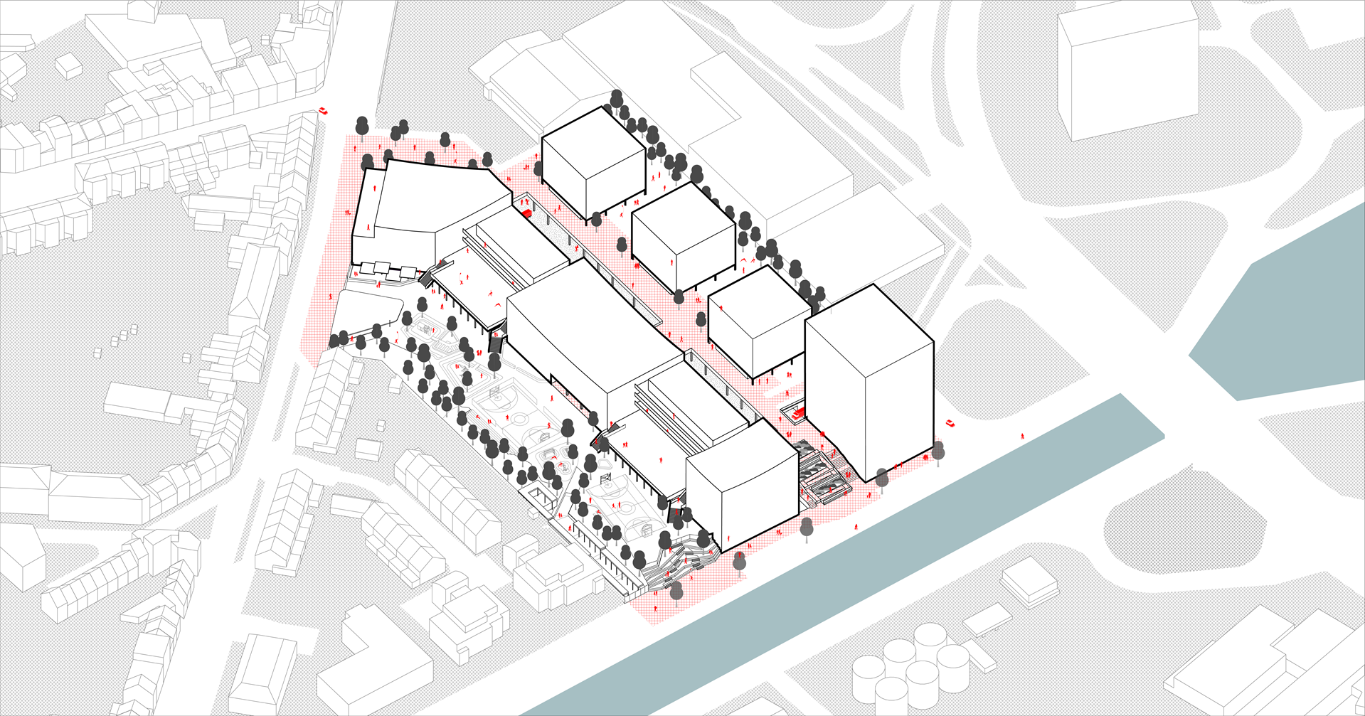 De schoolcampus is opgedeeld in 5 gebouwen die geleidelijk in hoogte oplopen naar het kanaal. Het kloppend hart wordt het Walcourtplein, dat tegelijk als inkomstplein voor de school en als buurtplein kan functioneren. Naast de trappartij wordt dit de tweede centrale ontmoetingsplaats. Wonen zal mogelijk zijn in drie woonvolumes van 7 bouwlagen boven op de productieve basis, in totaal 8 bouwlagen en goed voor 75 appartementen. Aan het kanaal komt een woontoren van 12 woonlagen boven op de dubbelhoge productieve basis. Die zal 82 appartementen omvatten.