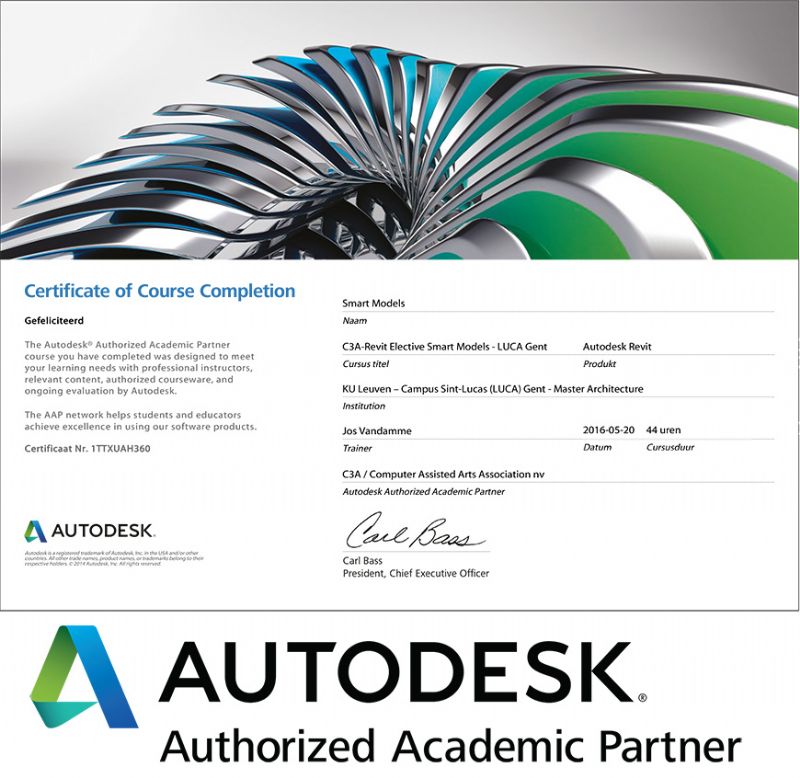 Sedert 2011 verzorgt architect Jos Vandamme van C3A als gastdocent jaarlijks een cursusreeks Revit aan KULeuven faculteit architectuur, campus Sint-Lucas Gent. Dit is een onderdeel van het keuzevak “Smart Models” van Kathy Corthals, Lector & onderwijscoördinator bouwtechnieken, waar de master-studenten architectuur kunnen op intekenen. Via REVIT wordt kennis gemaakt met de principes van Building Information Modeling: er wordt een intelligent parametrisch model gecreëerd, waar op diverse methoden data uit te genereren valt (meetstaten, bouwfysische gegevens,...).