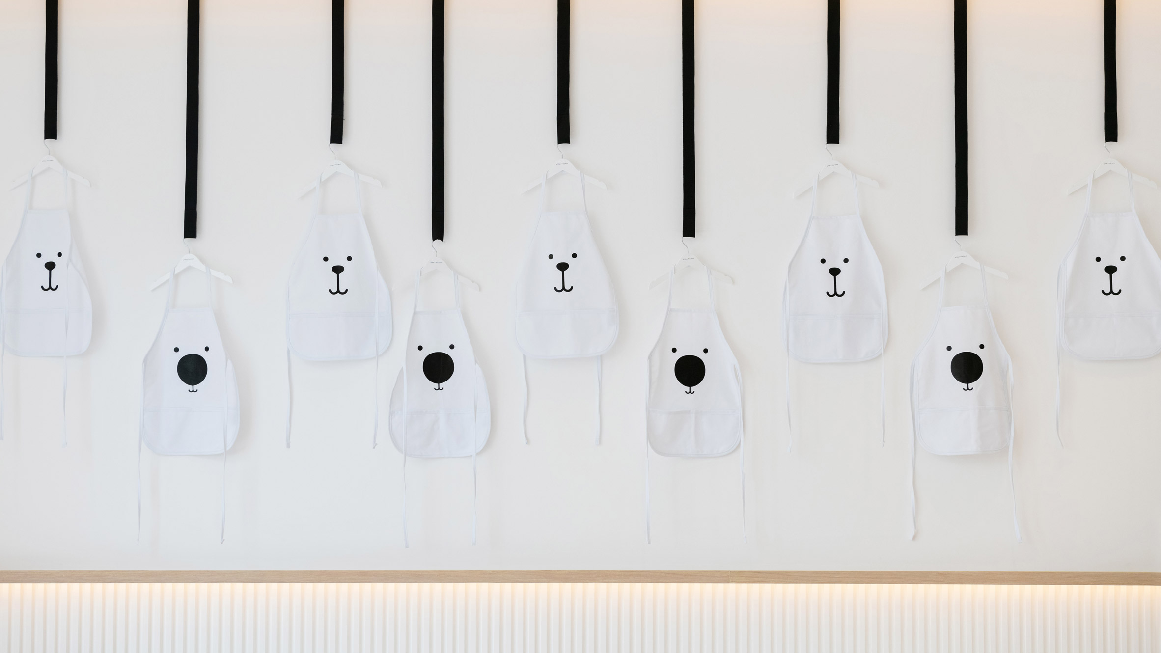 Verder zijn de spiegels versierd met tekeningen van dieren. Die staan eveneens op enkele wanden afgebeeld. Tot slot hangen er slabbetjes aan de muren, die er opnieuw op duiden dat de kleinsten onder ons hier thuis zijn. Die slabbetjes zijn bedrukt met hoofden van beren. Het restaurant zou dan ook niet ‘White & The Bear’ heten zonder het samenspel van witte tinten en beestige details.