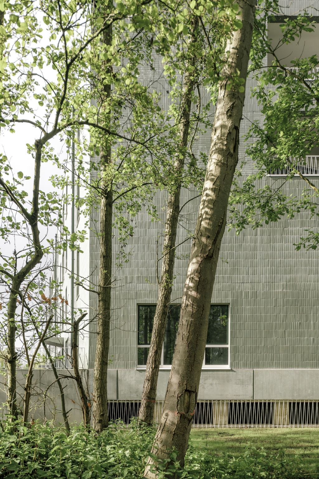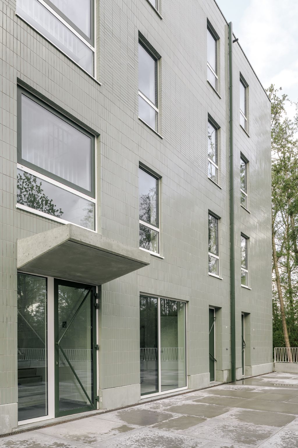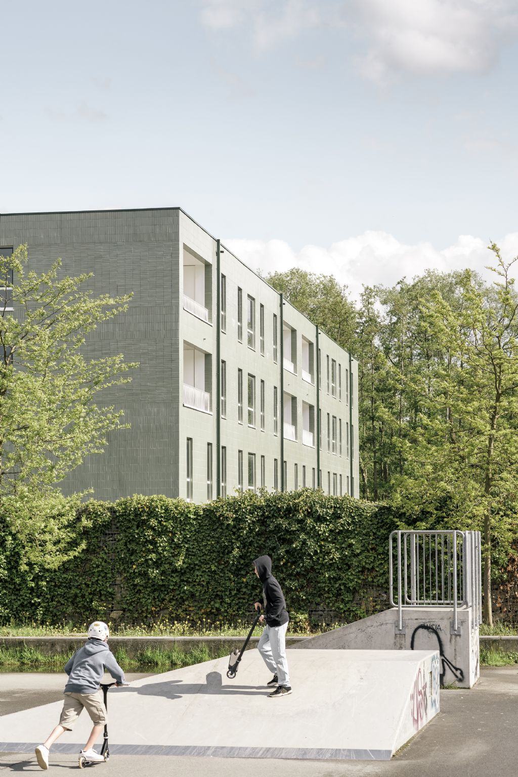 De gevels zijn bekleed met lichtgroene geglazuurde keramische tegels die hoofdzakelijk horizontaal zijn geplaatst. Ter hoogte van de vloerplaten worden de keramische tegels verticaal geplaatst. De verschillende oriëntatie van de tegels verschalen en ritmeren de twee woongebouwen. Het volledige geheel werd voorzien van een plint in prefab groene betonpanelen.