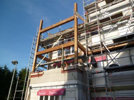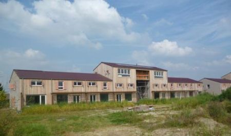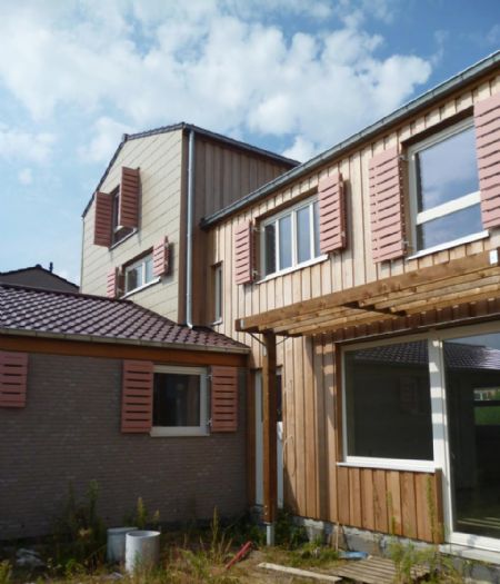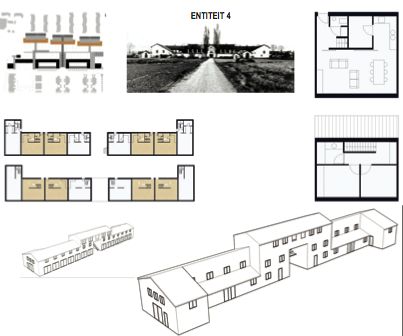 De woningen worden dus geïntegreerd in een ruimer landschap van sociale huur- en koopwoningen. Er is daarom gekozen voor een aangepaste bouwvorm waarbij de woningen gegroepeerd worden tot rijwoningen. Zo zullen acht ‘boerderijen’ worden gebouwd. Tussen de entiteiten is er een combinatie van kleine privétuintjes en een collectieve publieke tuin.