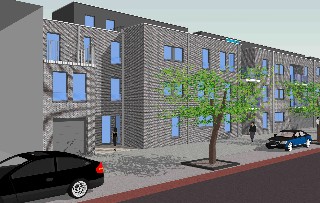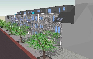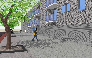 Om dit vrij grote bouwblok toch geen zwaar en massief uiterlijk te geven, is gespeeld met de volumewerking en het materiaalgebruik. Zo vindt de variatie in woningtypes zijn weerspiegeling in de gevel en zijn de toegangen achteruit geplaatst, wat het geveloppervlak breekt en een dynamisch karakter geeft.