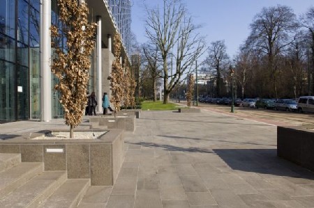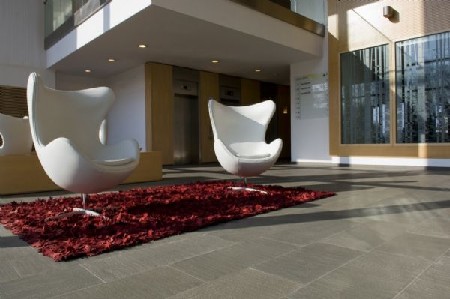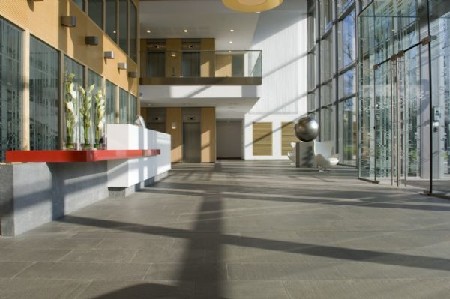 Beltrami leverde een unieke selectie gevelstukken en Opus Marble uit Nijvel zorgde voor de professionele plaatsing. De veelzijdige natuursteen Oriental Basalt werd eveneens toegepast als binnenbevloering in bandenformaat (+/- 275 m²) en als trapbekleding (+/- 40 treden). De plaatsing van binnentegels werd verzorgd door Carisel uit Braine – L’Alleud.