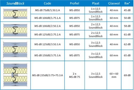 De opbouw van de SoundBlock-wand is gelijk aan die van een standaard Metal Stud-wand en dit zowel bij een enkel als bij een dubbel frame. SoundBlock-wanden geven echter een significant hogere geluidsisolatiewaarde Rw, zoals aangetoond in onderstaande tabel.