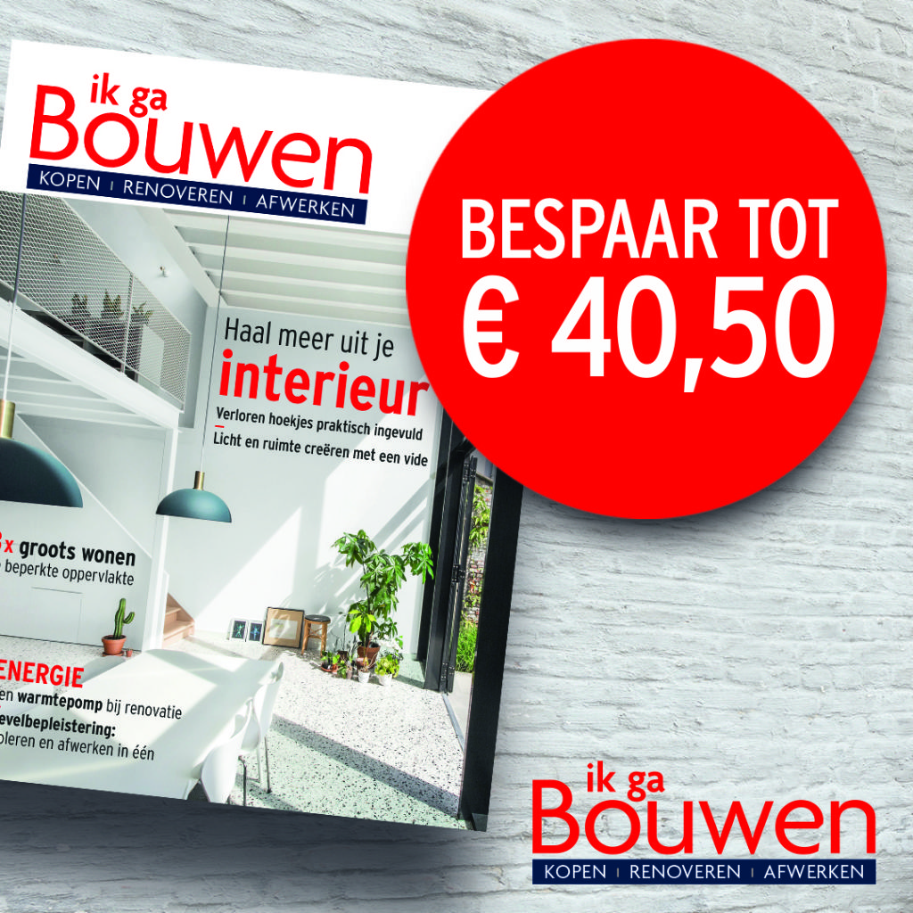 Ik ga Bouwen is dé referentie voor iedereen die belangstelling heeft in kopen, bouwen, renoveren of afwerken. Elke maand biedt ik ga Bouwen een hoop advies, praktische tips en inspiratie over energie, interieur en ruwbouw. Bovendien heeft ik ga Bouwen een nieuwe look met nog meer pagina’s, meer advies en meer inspiratie. Geniet nu 6 maanden (met €2 korting), 1 jaar (met €10,50 korting) of 2 jaar (met €40,50 korting) lang van tips & inspiratie!