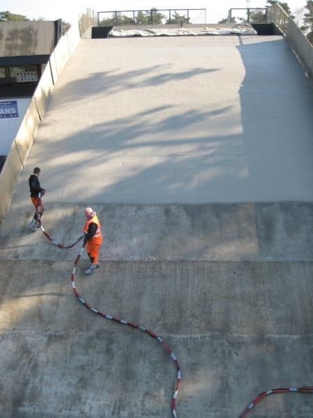 Voor Triflex, een bedrijf dat hoofdzakelijk gespecialiseerd is in wegmarkeringen en infrastructuur, is dit geen alledaagse toepassing. “Vooral omwille van de uitvoeringsmethode,” aldus Tony Overlaet. “De installateur heeft verschillende aanpassingen moeten doorvoeren. In principe staan al de installatietechnieken vast op een vrachtwagen, maar omwille van de beperkte bereikbaarheid hebben ze de slangen langer moeten maken.” Voorts waren er ook bij de voorbereidende werken enkele uitdagingen. Zo zijn het straalwerk en het zetten van de primer met een hoogtewerker moeten gebeuren. Enkel het spuiten zelf kon plaatsvinden op de betonvloer.