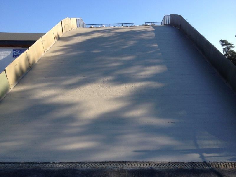 “De nieuwe starthelling laat het organiseren van wedstrijden toe, waaronder het WK,” vertelt Tony Overlaet. “Aanvankelijk dacht men voor de starthelling aan beton. Maar gezien de grote hellingsgraad is dat niet gemakkelijk uit te voeren. Daarom is gekozen voor een gespoten fietspadcoating, maar dan in een grijze kleur. Dat is de Preco Cryl Kaltplastik SP 3K. Deze is stroef genoeg (zodat men niet naar beneden schuift) en heeft daarnaast ook een uniforme kleur.”