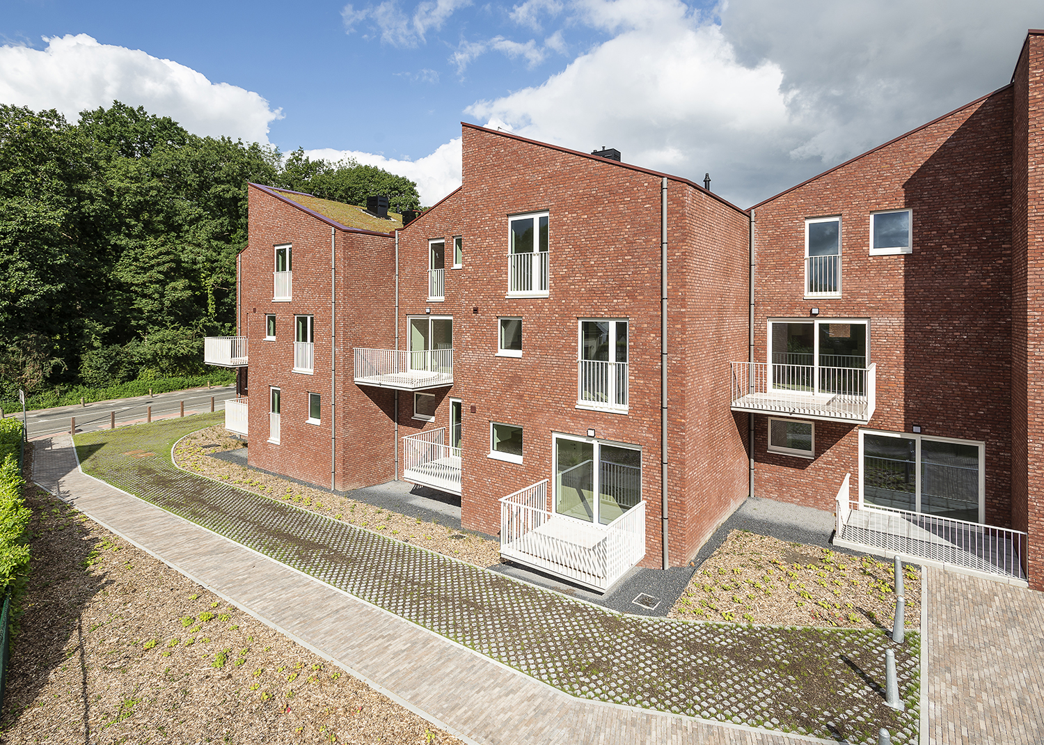 Het niveauverschil op het perceel van ongeveer 2 meter werd op behendige wijze in en rond het project aangewend om een mooi volumespel te bekomen en toch via paden (ook toegankelijk voor mensen met beperking) het project te doorkruisen door de groene open patio’s.