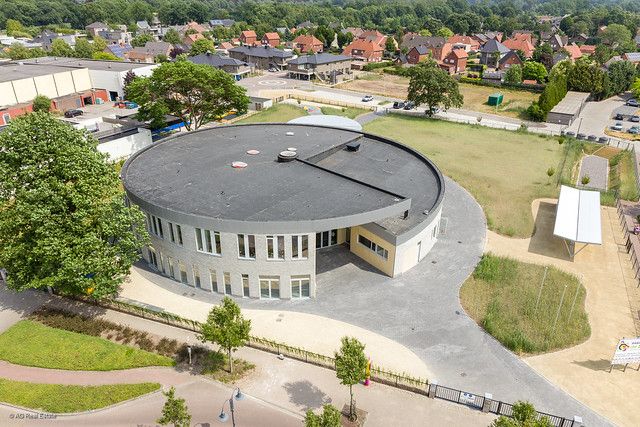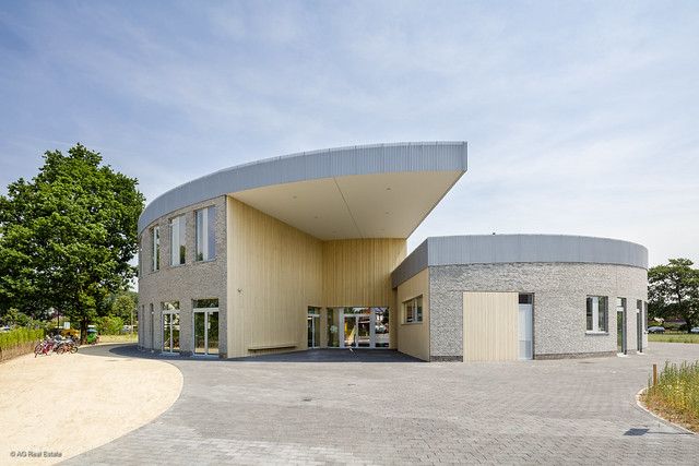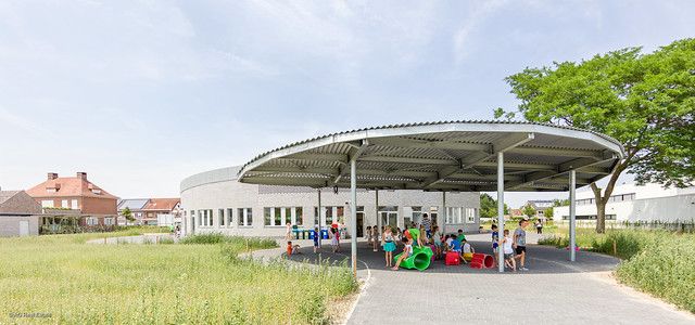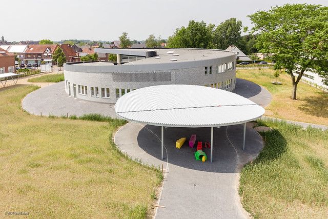 Een uitnodigend volume creëren dat in het oog springt en perfect in de groene omgeving past: dat was het opzet bij de realisatie van dit nieuwe gebouw voor GO!-basisschool De Brug in Bocholt, de allereerste ronde school in Vlaanderen. Het cirkelvormige grondplan en het spiraalvormige dak geven de markante constructie een uniek karakter. Al was het allerminst een sinecure om het gedurfde ontwerp in de praktijk te brengen …