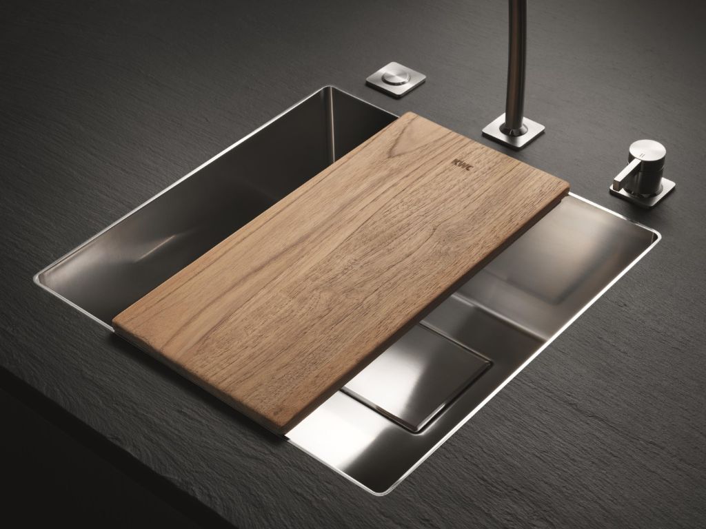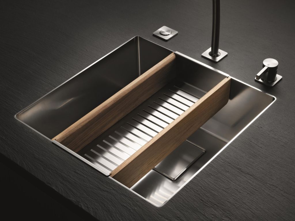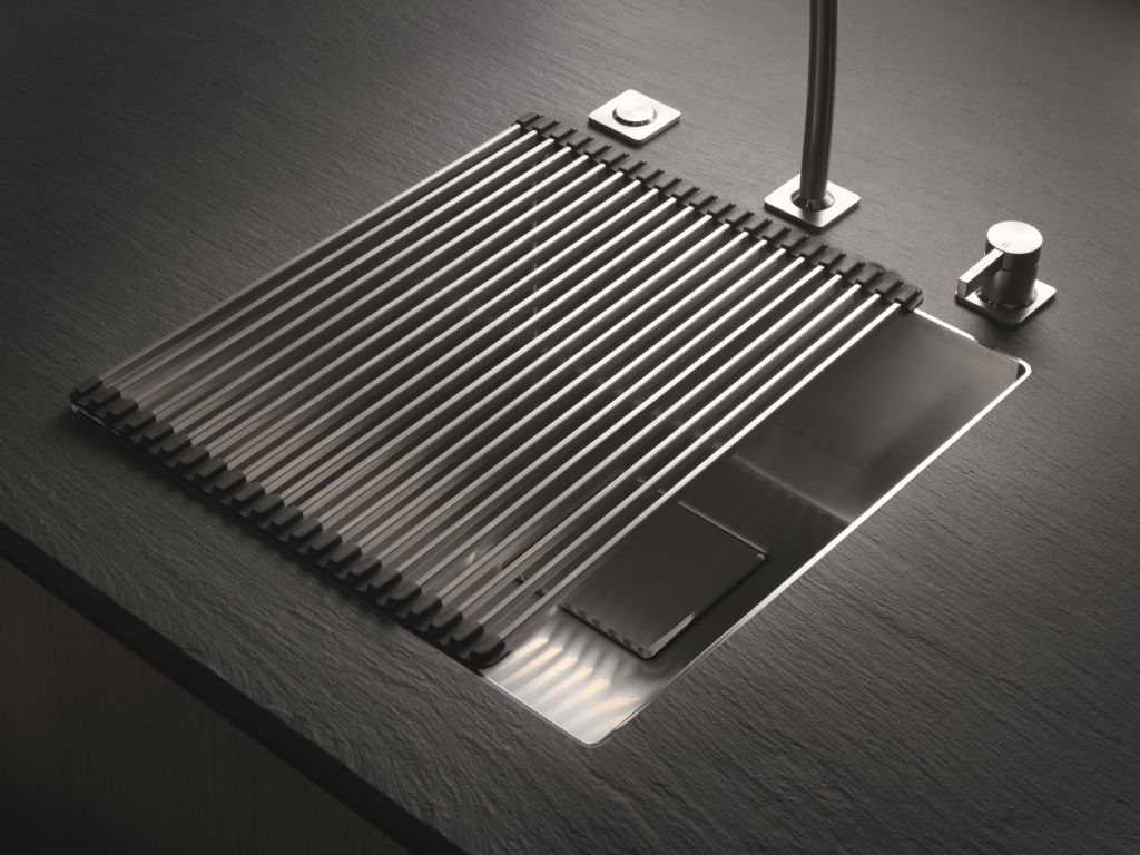Bij het Era-concept horen drie accessoires. Een massieve teakhouten snijplank die kan inschuiven in de spoelbak of die je er ook naast kan gebruiken. Als tweede het geperforeerde roestvrijstalen afdruipbakje met teakhouten zijkanten dat in de spoelbak past. Ten slotte een oprolbare afdruipmat uit roestvrijstalen staafjes die met elkaar verbonden zijn door zwarte silicone.