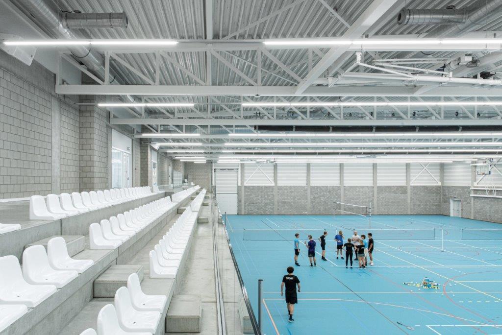 Archiles architecten, dat een onvervalste thuismatch speelde, sloeg de handen in elkaar met het Nederlandse ZJA architecten. “We hebben vanaf het prille begin intensief samengewerkt, waarbij ZJA kon bogen op een uitgebreide ervaring in de realisatie van grotere sportcomplexen en wij de link legden met de plaatselijke besturen en de lokale wetgeving”, vertelt Luk Segers, architect-oprichter bij Archiles architecten. “Dankzij onze complementariteit konden we de concepten en ontwerpen voortdurend bijsturen en optimaliseren. Ook de uitvoering, die plaatsvond in volle ‘covidstorm’ en die in goede banen werd geleid door Vanhout.pro, volgden beide bureaus van nabij op. Daarbij was het uiteraard een enorm voordeel dat wij snel de nodige controles en vaststellingen op de werf konden doen. Om toch ergens een taakverdeling tussen beide bureaus af te spreken, zorgde Archiles architecten voor al wat met het exterieur van het sportcentrum te maken had (gevels, volumetrie, omgevingsaanleg …), terwijl ZJA de interieurvormgeving voor zijn rekening nam.”
