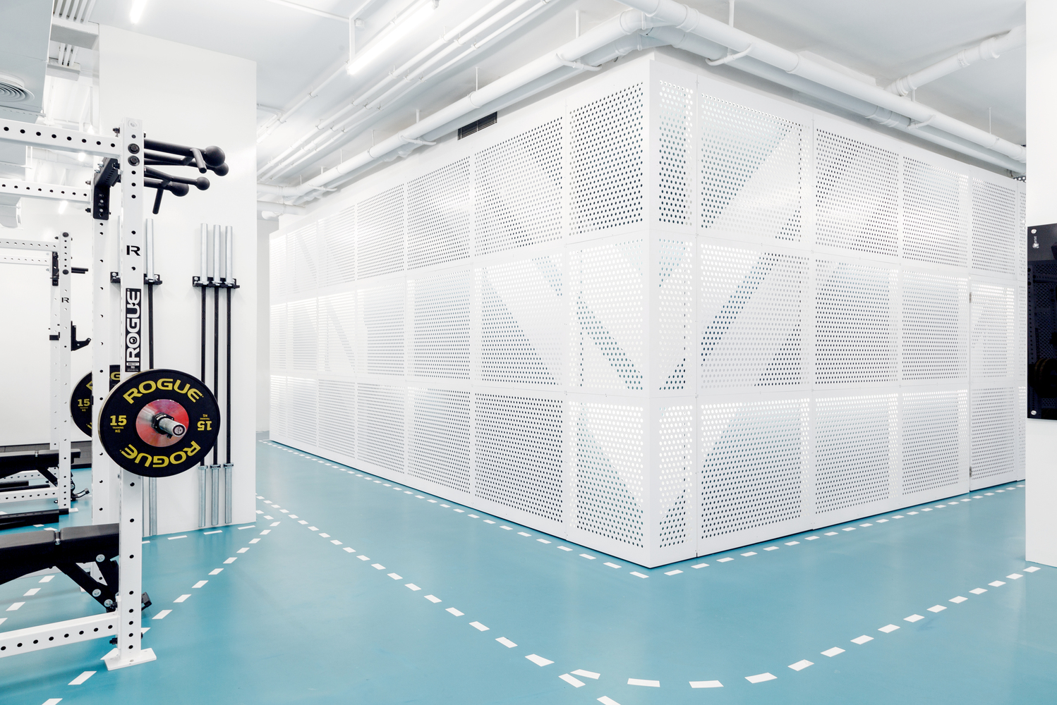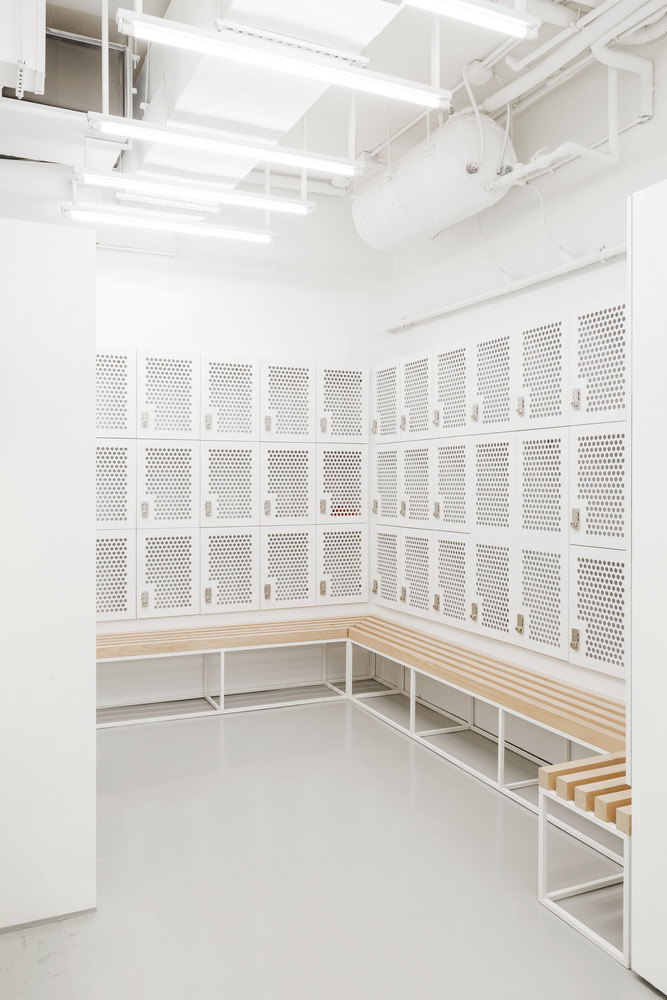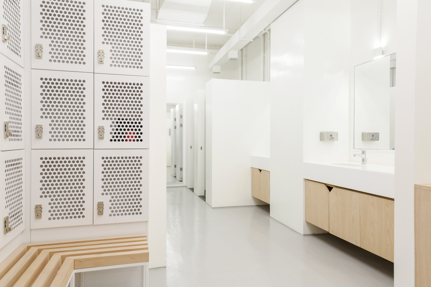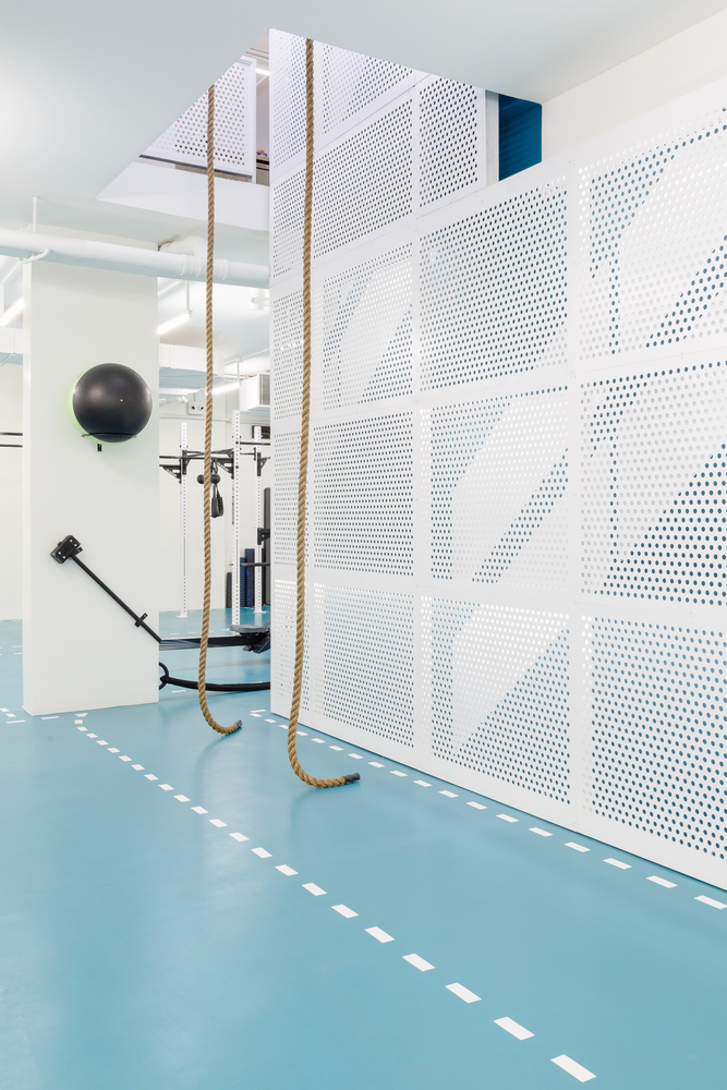 Wat meteen opvalt aan ‘Vim & Vigor Gym’ zijn de kleuren. Daar waar de meeste sportscholen opteren voor donkere tonen, bestaat dit complex uit lichte tinten. Het gaat hier voornamelijk om wit en muntblauw. Die beslissing werd bewust genomen. Zo blijkt uit onderzoek dat blauw een energiebooster vormt. En dat is goed voor mensen die een potje willen sporten. Mint keert onder meer terug in de vloer van de kelder. De witte stippellijnen erop benadrukken dat het hier wel degelijk om een fitness gaat. Ze zorgen er eveneens voor dat de ruimtes in elkaar overvloeien.