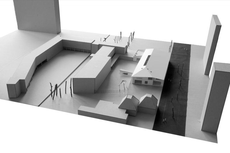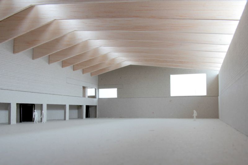 Om de dialoog met de bestaande school te bewaren koos het ontwerpteam in het onderste volume voor lichtgrijs metselwerk. Met het houten groen dak proberen ze voor de hoge omwonenden een groene muur te bieden. De ontwerpers besteedden hieraan zorgvuldig aandacht. Houten gelamineerde liggers moeten het daklicht breken, in combinatie met het grote raam aan de oostkant zorgt dit voor een indirect en diffuus licht. Dankzij de uitkragende luifels aan de kopse gevels zitten sport en jeugd mooi samen onder een dak.