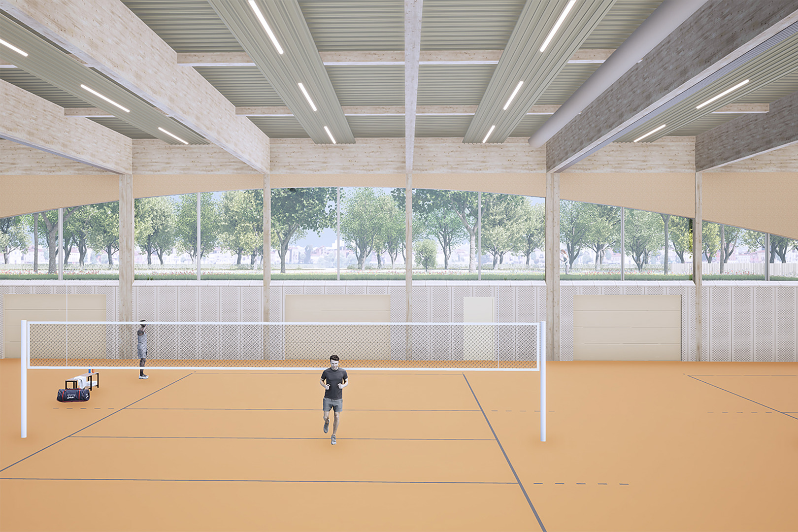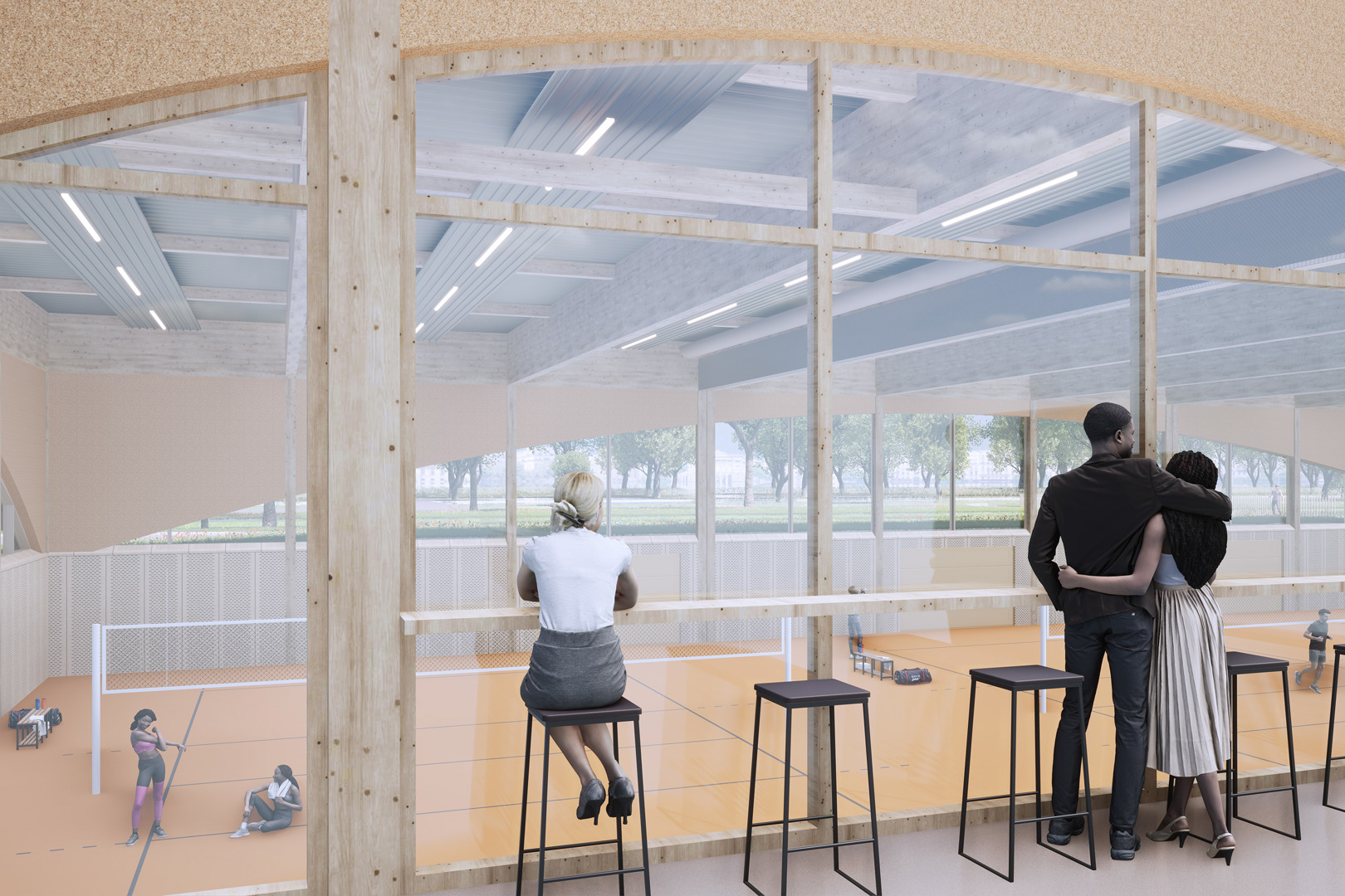 Door de sportvloer te verdiepen, ontstaan bovendien op maaiveldniveau openingen die binnen en buiten met elkaar verbinden. Voorbijgangers krijgen zicht op de activiteiten binnen, terwijl gebruikers contact houden met de omgeving.