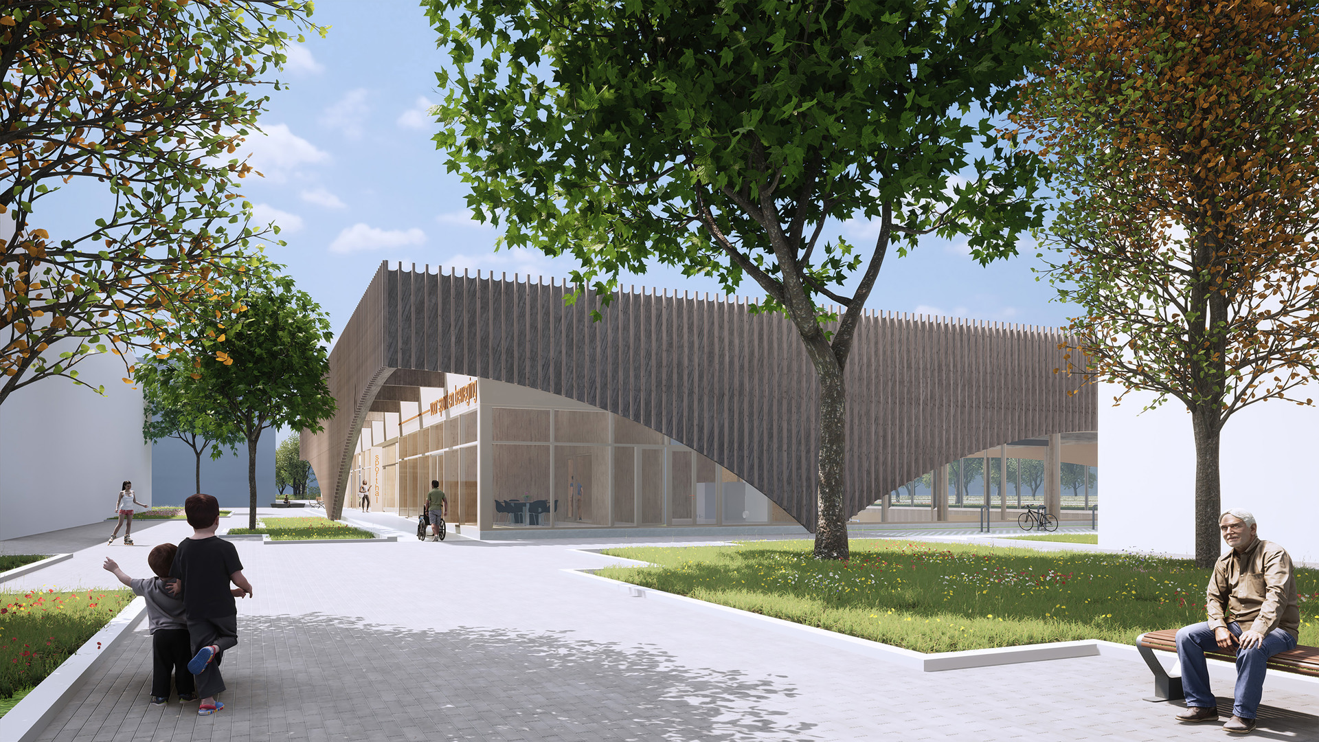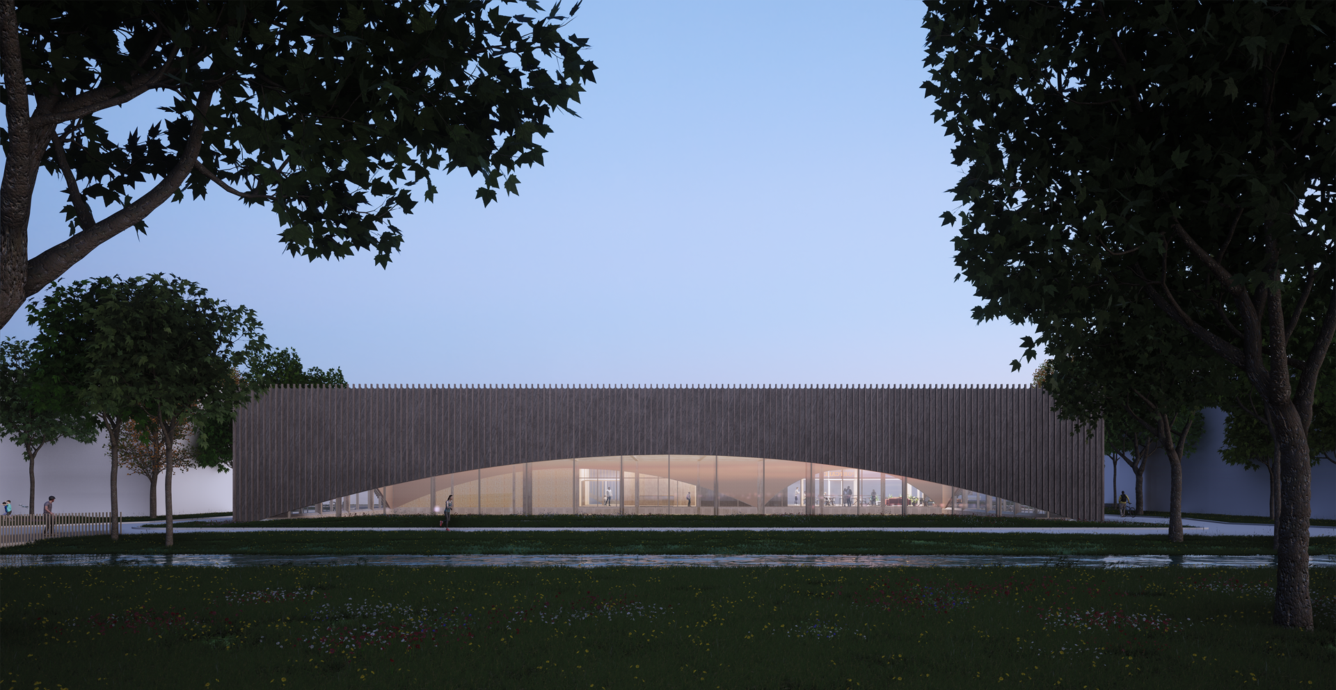 Het ontwerp is opgebouwd vanuit een duidelijke hoofdvorm: monolithisch en sculpturaal. Van een afstand oogt de sporthal als een krachtig volume met herkenbare openingen en een speelse dakrand. Dichterbij ontvouwt zich een gelaagd gebouw, met ritmische gevels en verfijnde details voor de oplettende ontdekker.