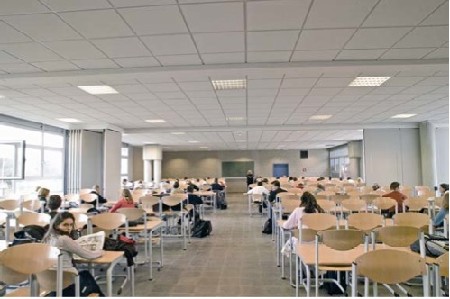 • Vergroten van het oppervlak geluidsabsorptie, wat meestal gebeurt door het aanbrengen van een akoestisch plafond van minerale wol (type Rockfon). Een groot aantal Rockfon producten hebben een geluidsabsorptie van 1,00 wat betekent dat 100% van de geluidsenergie wordt omgezet of doorgevoerd. Het zal dan in een traditioneel klaslokaal (180‐250 m3) volstaan een akoestisch plafond aan te brengen om een goede akoestiek te bekomen.