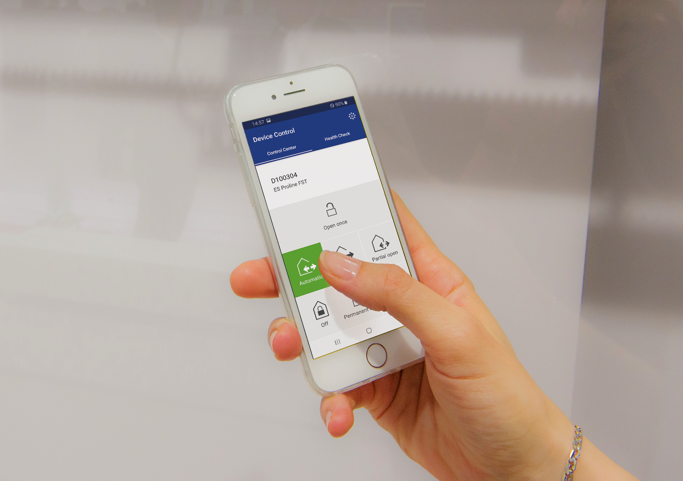 De ES PROLINE aandrijvingen zijn optioneel te koppelen aan de dormakaba Door Pilot Interface. Dit laat toe om via een smartphone of ander mobiel apparaat de status van de aandrijving op te vragen en instellingen aan te passen. Dankzij deze connectiviteit wordt niet alleen de bediening eenvoudiger, maar wordt ook het onderhoud vereenvoudigd en kan de service sneller verlopen.