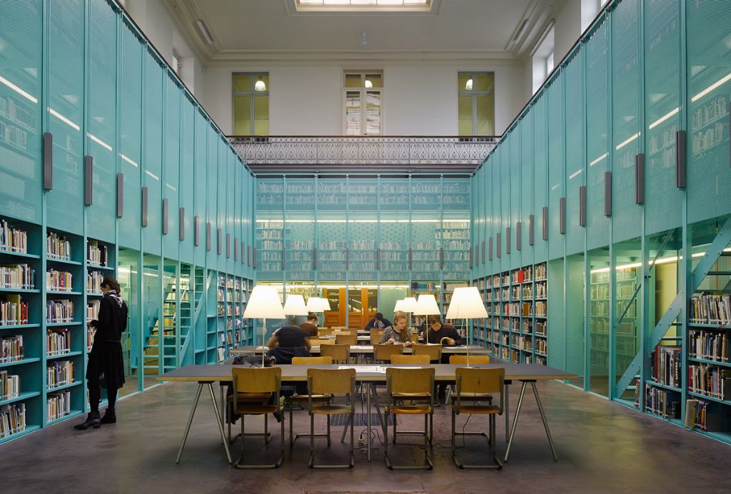 De nieuwe bibliotheek voor de vakgroep Architectuur en Stedenbouw aan de Universiteit van Gent is opgevat als een groot paviljoenachtig meubel met drie verdiepingen, dat de ruimte onder het balkon in de voormalige practicumzaal inneemt. De perimeter van de bibliotheek wordt gevormd door kasten, met andere woorden door boeken zelf. Door op het ritme van de perimeter een hekwerk te schuiven wordt de collectie wel of niet toegankelijk, om zodoende de boeken te beschermen bij andere activiteiten, zoals recepties, lezingen, enzovoort. Met een hart-op-hart afstand van 1 meter profileren slanke stalen vinnen van 6 mm dikte zich als de portieken van een rondgang die vele functies in zich draagt. Binnenin de betreedbare ‘wandkast’ is een modulaire, geplooide plaat ingezet als vloerplaat, boekenplank, traptrede en bureau- blad. Het was zaak de constructie zo fijn gedetailleerd, elegant en licht mogelijk te houden, terwijl ze toch het gigantische gewicht van boeken moet opvangen.