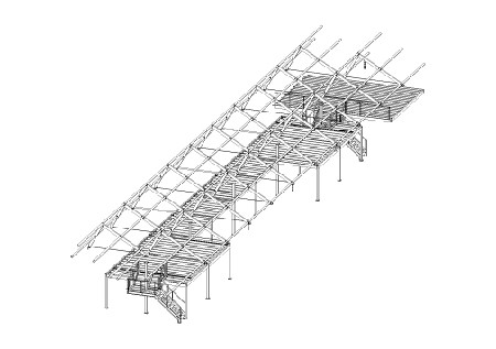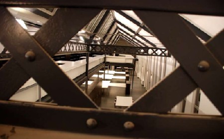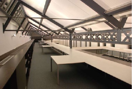 Er werd voor geopteerd om deze stalen structuur zo veel mogelijk te behouden. Het geheel werd zorgvuldig gedemonteerd, hersteld waar nodig en voorzien van de noodzakelijke boringen en koppelingen voor de uitbreiding met een stalen dakgeheel en een extra werkplatform. Het platform werd volledig los gehouden van de bestaande wanden. De volledige ruimte is 50 m lang en 10 m breed. Het platform heeft een lengte van 40 m en is 7,50 m breed. Centraal in de ruimte werd een vide voorzien om interne vergaderingen te organiseren en het geheel ‘open te trekken’. In totaal werden er in de ruimte een vijftigtal werkplaatsen gerealiseerd.
