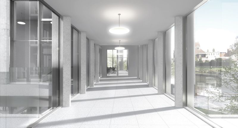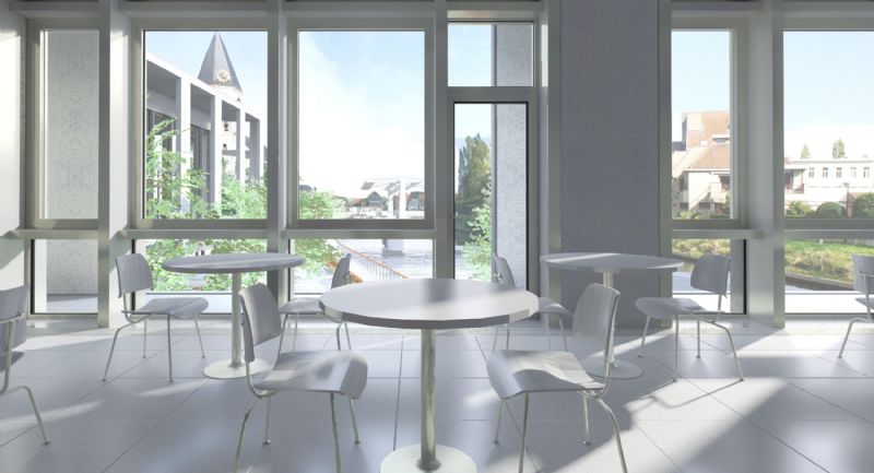 Het nieuwe gebouw vervolledigt de stadskern aan de Leie. Zo creëert de oksel van het gebouw een openbare plek langs de rivier. Hier zal het aangenaam vertoeven zijn voor toekomstige voorbijgangers. Vanuit functioneel oogpunt is het een aangename werkplek voor de stadsdiensten, maar ook voor de bezoekers. Zij hebben bovendien zicht op de stad en op de Leie.