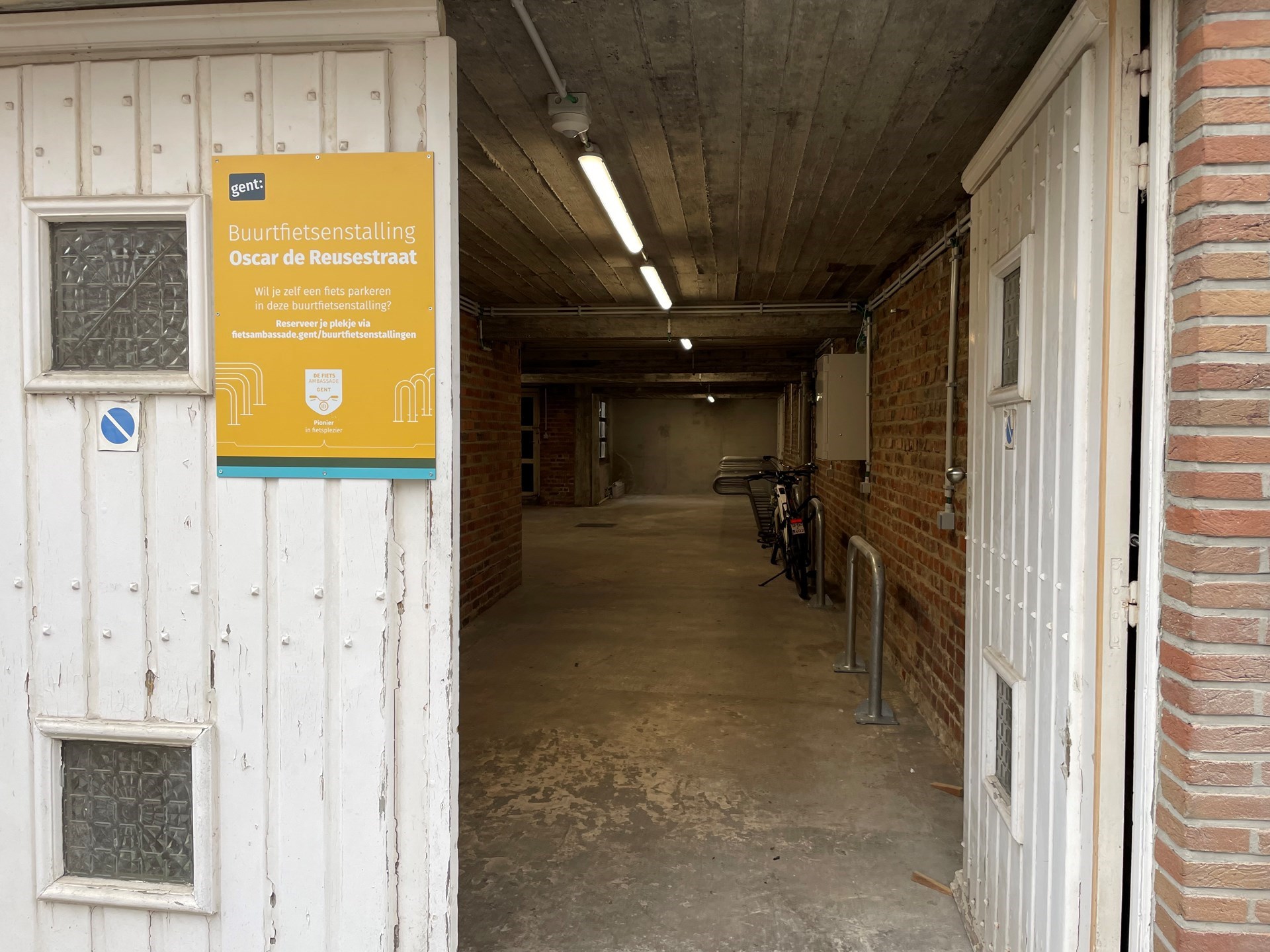 De eigenaars van een appartementsgebouw in de Oscar De Reusestraat reageerden op een oproep in het Gentse stadsmagazine naar geschikte locaties voor buurtfietsenstallingen. Ze waren op zoek naar een nuttige en duurzame invulling voor de benedenverdieping. Het is meteen ook de eerste buurtfietsenstalling die gerealiseerd werd in samenwerking met de eigenaars van een privaat gebouw.