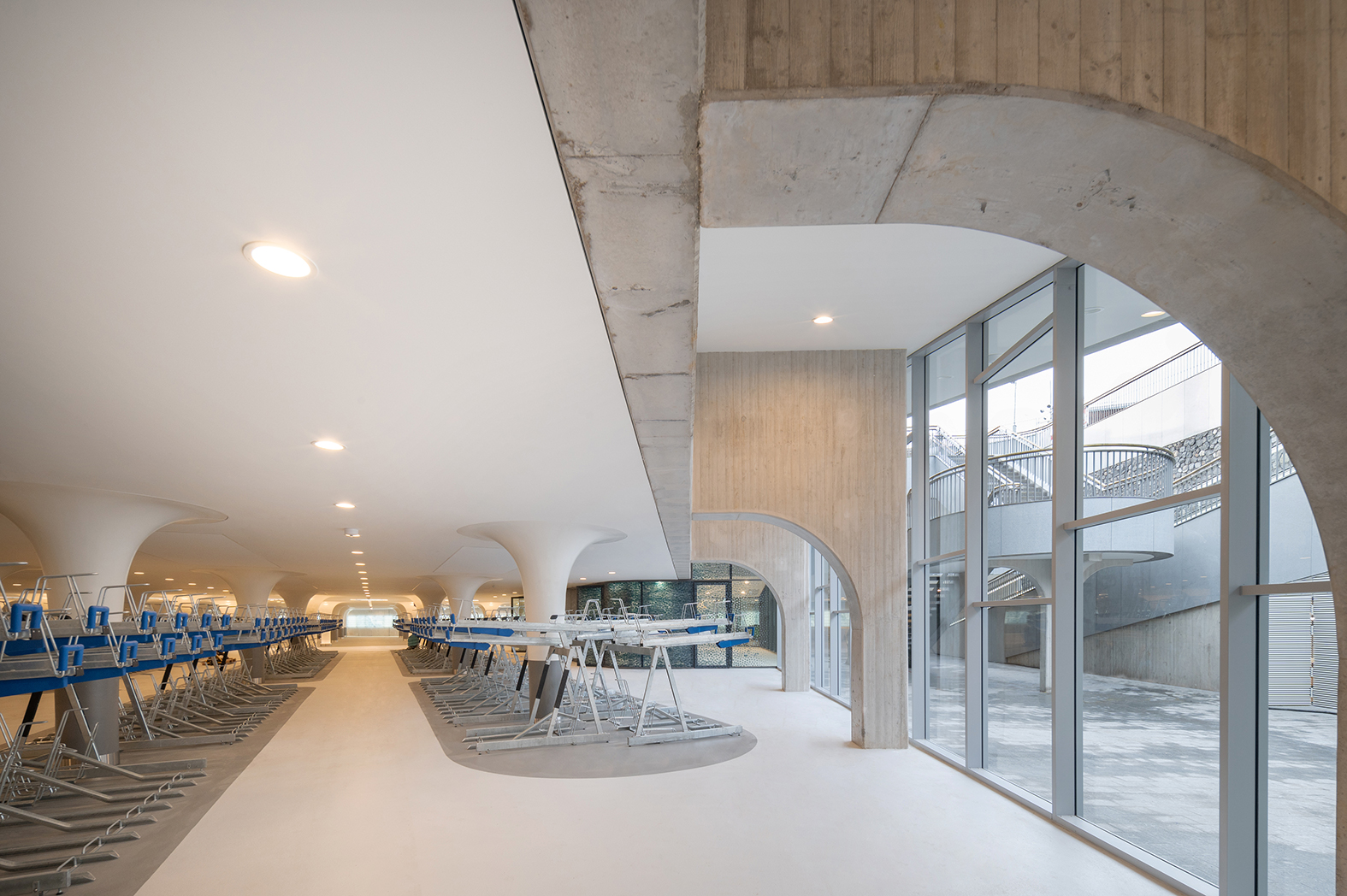Terwijl de materialisering van de hoofdentree robuust en ruw is, is de stalling van binnen een gladde, lichte wereld, voorzien van een gecoate gietvloer en een naadloos, wit plafond. Het is een tegenstelling die doet denken aan een oester, met zijn ruwe schelp en gladde binnenkant. Binnen deze metafoor is het volume met de beheerdersruimte en het fietsservicepunt op te vatten als de parel in de oester. Dit volume bevindt zich op een centrale, strategische positie, naast de ontvangstruimte en met overzicht over de hele stalling. De ‘parel’ heeft de vorm van een afgeschuinde glazen rechthoek met afgeronde hoeken, uitgevoerd in gebogen glas dat is voorzien van een waterpatroon.