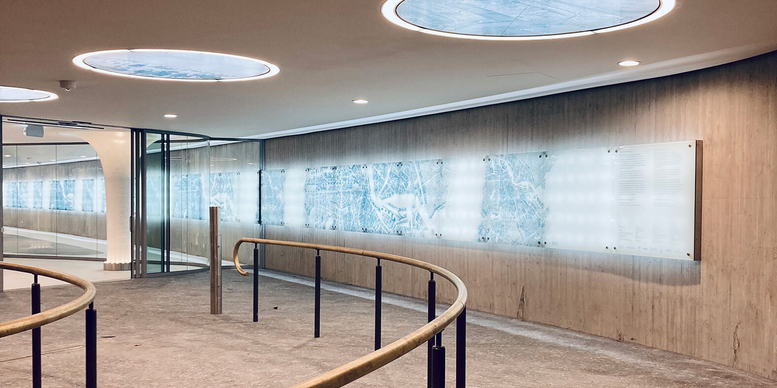 De hele rechterwand – de Horizon – is voorzien van een glazen pui met daarop stadsplattegronden van het ontstaan van de stad tot de 21ste eeuw. Deze stadskaarten zijn opgebouwd uit allemaal kleine afbeeldingen; foto’s en schilderijen die de verbinding tussen Amsterdam en het water benadrukken. Dit thema komt ook terug in de Oculi; de ronde verlichtingsarmaturen in het plafond van het hoofdpad (de colonnade).