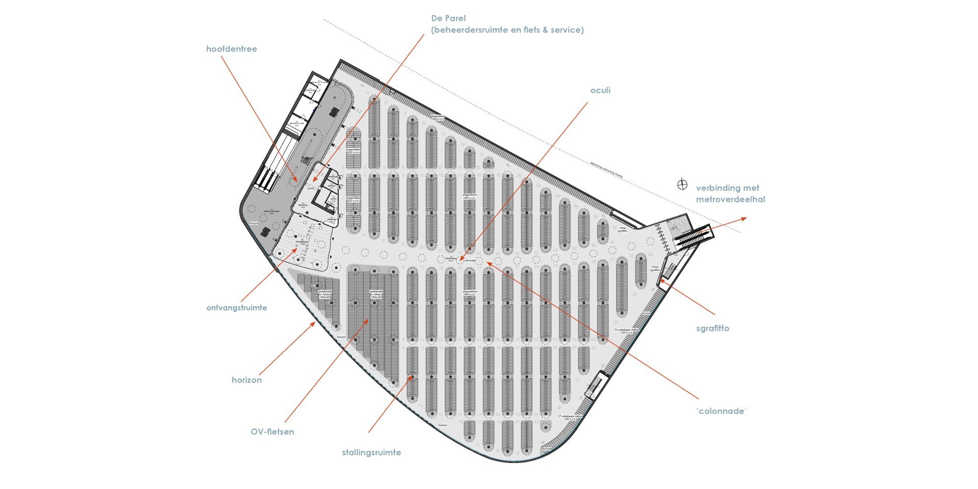 De ruim opgezette ontvangstruimte vormt het scharnierstuk tussen de hoofdentree en de ‘colonnade’, het brede centrale hoofdpad dat de stalling diagonaal doorkruist en dat wordt gemarkeerd door een dubbele rij witte druppelkolommen. Bij het betreden van de stalling vanuit de ontvangstruimte is onmiddellijk aan het einde van de colonnade de andere uitgang te zien: de verbindingstunnel die leidt naar de metro en het station. Het stijgpunt naar deze verbindingstunnel wordt geflankeerd en verbijzonderd door twee sgraffito’s van kunstenaar Lex Hoorn. Aan weerszijden van de brede, gekromde colonnade liggen de gangpaden met fietsenrekken. Om de oriënterende functie van de colonnade te versterken worden de druppelkolommen van onderen aangelicht.