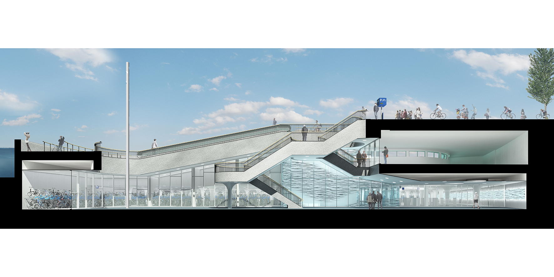In het water voor de hoofdingang van Amsterdam Centraal Station, op het deel van de Prins Hendrikkade dat tot juli 2018 dienst deed als busstation, is het grootste fietsparkeergarage van Amsterdam gerealiseerd. Het ontwerp van het Rotterdamse bureau wUrck, dat ook verantwoordelijk is voor het ontwerp van de lage kade en supervisor van alle architectonische componenten van de Entree, benadrukt de ligging onder het wateroppervlak.