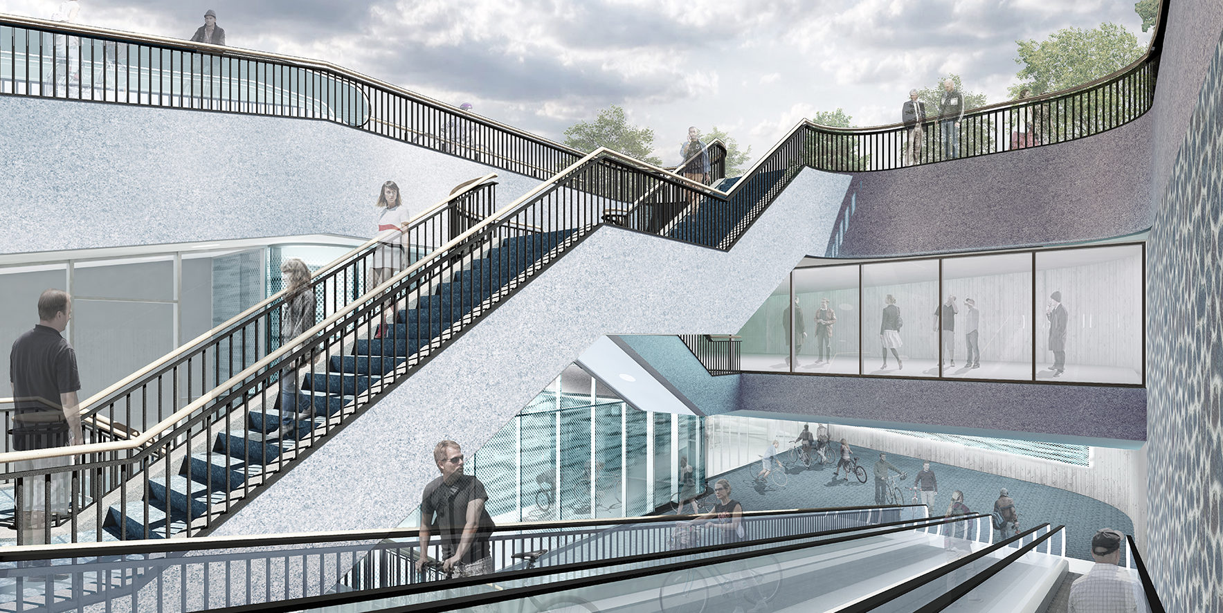 De stalling tussen de Prins Hendrikkade en het Stationsplein bevindt zich immers ruim negen meter onder maaiveldniveau. Erboven ligt het domein van de rondvaartboten. Om het hoogteverschil te overbruggen is een monumentale entree ontworpen met een hoogwaardige materialisering. Rolpaden voeren de gebruiker naar beneden, langs een wand die is vormgegeven als een continuering van de kademuur, met een vloeiende vorm van grillig basaltsteen. De rolpaden zijn onderdeel van een stijgpunt dat als een natuurstenen sculptuur de imposante ruimte vult. Een hoge glazen wand aan de binnenzijde van de entreeruimte zorgt ervoor dat de diepgelegen stalling toch van daglicht wordt voorzien.