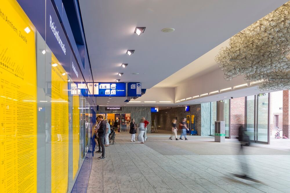 Met de plaatsing van zo’n 8000 m2 OWAplan door Verwol Complete Interieur Realisatie had ook OWA een aandeel in het Beste Gebouw van 2017. Het naadloos akoestische OWAplan werd in diverse kleuren toegepast in de stationshal, trappenhallen, passagiersgangen, fietsenstallingen en het busstation. Vooral de toepassing in het busstation was bijzonder volgens Leon Spijkers, Commercieel Technisch Adviseur bij OWA. Hij legt uit: “Omdat de bussen op dezelfde hoogte als de treinen het overdekte busstation inrijden, wenste de opdrachtgever de best mogelijke akoestische omstandigheden. Dankzij de hoge absorptiewaarde van OWAplan wordt het lawaai van de binnenrijdende bussen flink verminderd. Omdat het busstation zich in de buitenlucht bevindt en de rijdende bussen voor extra trillingen zorgen was het de vraag of OWAplan geplaatst kon worden. Na uitvoerige tests op trek- en drukkrachten in een windtunnel kwam OWAplan met vlag en wimpel uit de tests. Het gevolg: een naadloos plafond met slechts één bouwkundige dilatatie op 4500 m2 dat bovendien een aangenaam geluidsniveau verzorgt in het drukke busstation.”