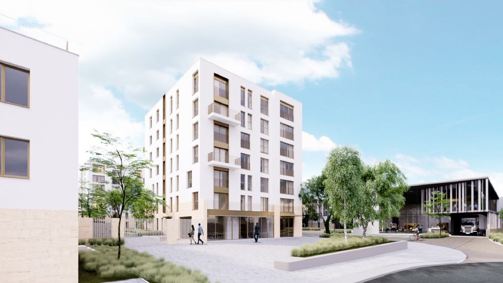 Het wooncomplex met 123 appartementen wordt ingeplant op het zuidoostelijke gedeelte van de site. Het directe contact met de straat versterkt de stedelijkheid van de Middelweg en draagt bij tot de informele sociale controle in de openbare ruimte. Het complex bestaat uit drie hoofdvolumes die in een open bloktypologie gegroepeerd zijn rond een centrale gemeenschappelijke tuin. De onderlinge afstand tussen de volumes biedt zicht op de tuin vanaf de Middelweg en de straten van het bedrijventerrein. Hierdoor neemt het groen integraal deel aan de creatie van een stedelijke sfeer.