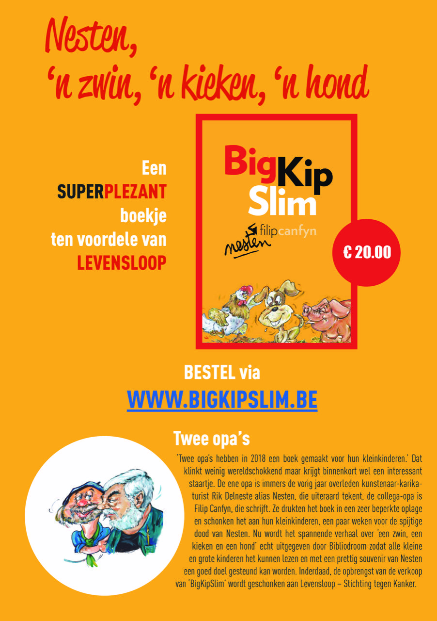 Op 5 september 2019 wordt de spannende vertelling over een big, een kip en een hond (‘Bigkipslim’ is dan ook de titel) écht uitgegeven door Bibliodroom zodat alle kleine en grote kinderen het ook kunnen lezen én met een prettig souvenir van Nesten tevens een goed doel kunnen steunen. Nesten was immers peter van Levensloop – Stichting tegen Kanker en de opbrengst van de verkoop van ‘Bigkipslim’ gaat naar deze fantastische actie.
