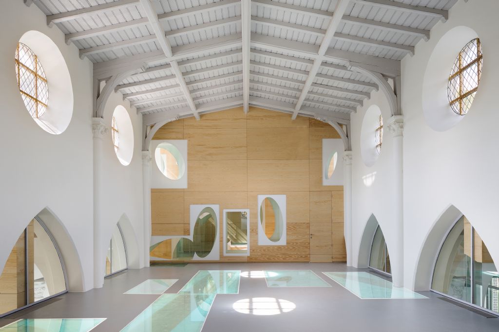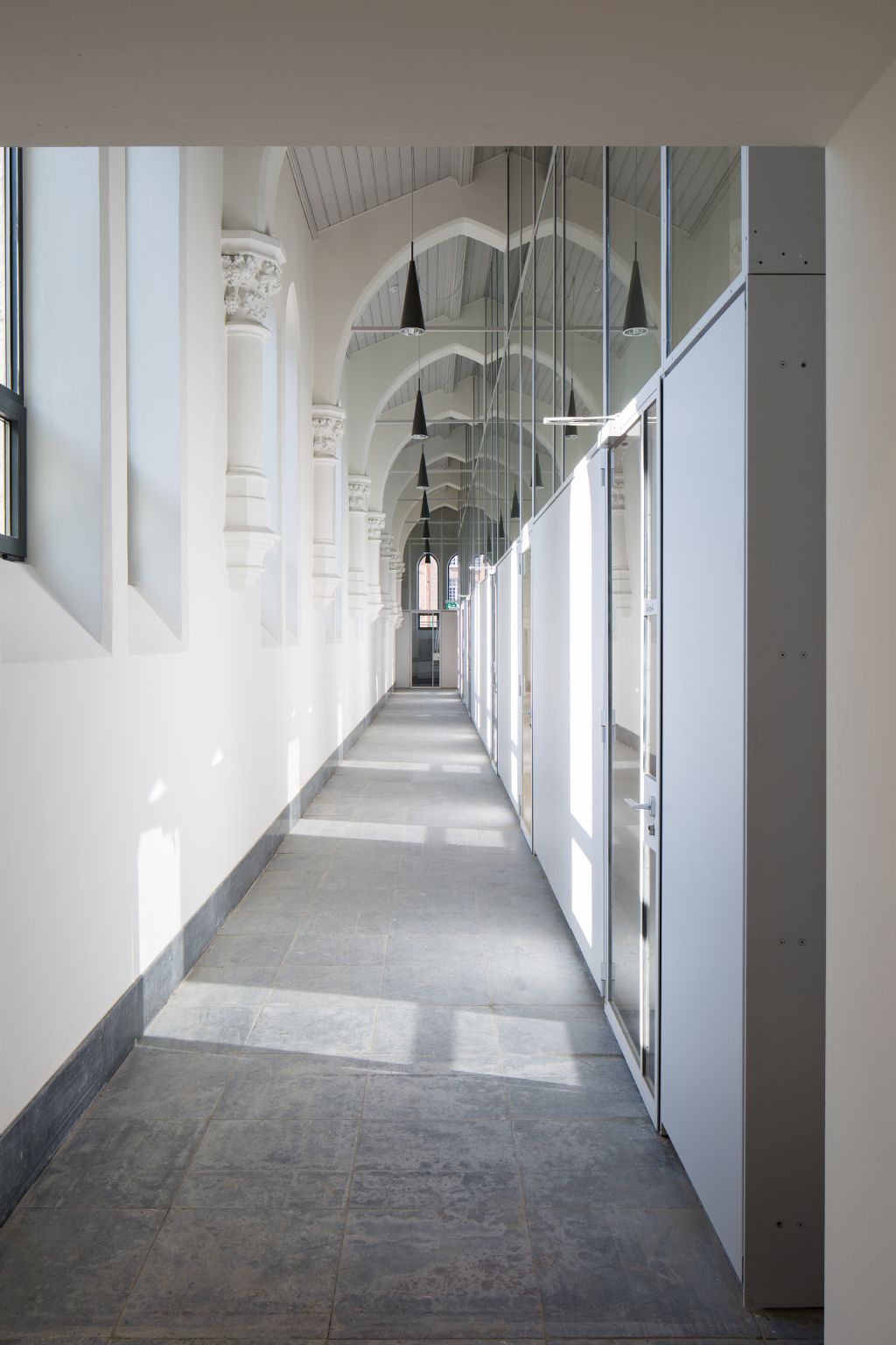Het plan- en beeldmateriaal (fenomenale foto’s van Frederik Vercruysse), dat ik op websites bekijk in het kader van de research voor een artikel over de herbestemming van kerken, kapellen en kloosters tot nuttige ruimten voor onderwijs, fascineert mij mateloos. De doelgroep heeft het project om evidente redenen onder de radar gehouden maar ik wil meer weten. Hoe vorm je een geklasseerde kapel uit 1860, die vanaf 1974 een vergeten opslagplaats wordt, om tot een significante lesplek?