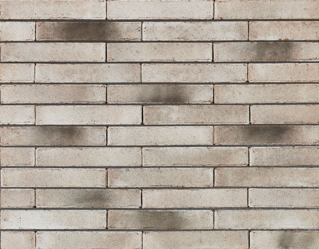 ALPHA is een moderne gevelsteen met ruw oppervlak, overwegend lichtgrijs met beige schakeringen en af en toe zwarte accenten.