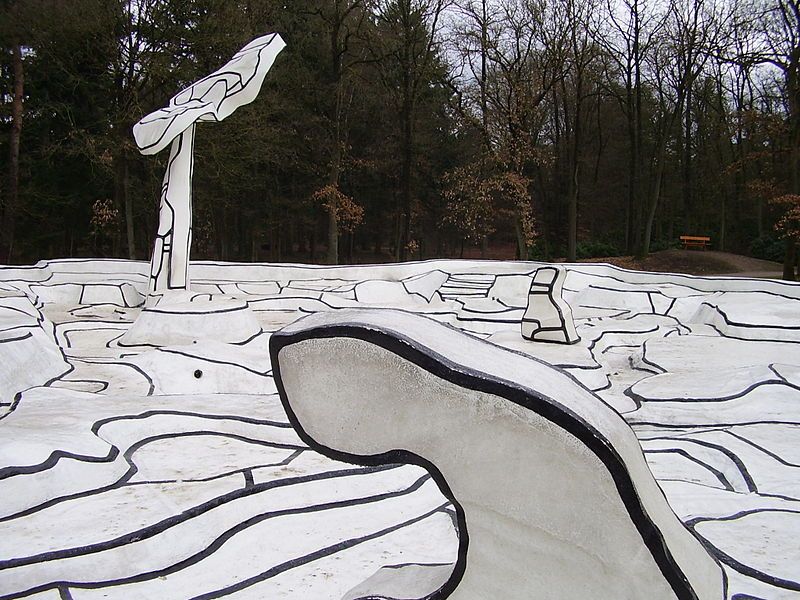 “Jardin d’Email” van Jean Dubuffet, de regent van de art brut, lag daar plezant plastisch te wezen met een immense hoop witgeschilderd beton inclusief sprekende zwarte lijnen. Op deze bijna goddelijke, op het gras in het bos achteloos achtergelaten en zich welwillend uitvlakkende koeiendrol speelden kinderen en mijmerden ouderen voor ze weer het steile trapje in het smalle torentje zouden nemen richting de wereld daar ergens. Hier werd immers buiten even binnen. Intiem, metelijk, eindig. Dubuffet gaf een vloer aan de eeuwige ruimte en maakte zo architectuur van kunst.