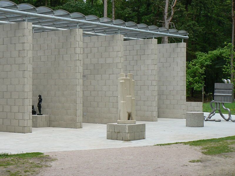 Absoluut hoogtepunt werd nog, tegen sluitingsuur aan, het ver verstopte Aldo Van Eyck-paviljoen, een reconstructie uit 2006. Deze Nederlandse architect, die met het ontwerp van ruim zevenhonderd speelpleintjes vanaf de jaren zestig Amsterdamse stadsgeschiedenis schreef, gebruikte hier zijn geliefkoosde beton(stenen) om rechte en bolle wanden te bouwen en een schuilplaats voor vooral interbellum-beeldhouwwerken in het bos over te houden, uit te sparen, in te kaderen. Een welingelichte bron had mij nog maar enige dagen eerder toevertrouwd dat het opnieuw in de mode kwam, het brutalisme, maar ik moest slechts eventjes aan dat onbehouwen woord denken. Niemand merkte het op maar het kon wellicht ook niemand wat schelen. Het paviljoen onder een transparant dak schiep in elk geval uit het niets een doolhofje voor ontdekkers, waarvan de boomkruinen volop kunnen meegenieten. Van Eyck deelde lucht in en filterde licht uit. Hij gaf muren aan de onmetelijke ruimte en maakte zo kunst van architectuur.