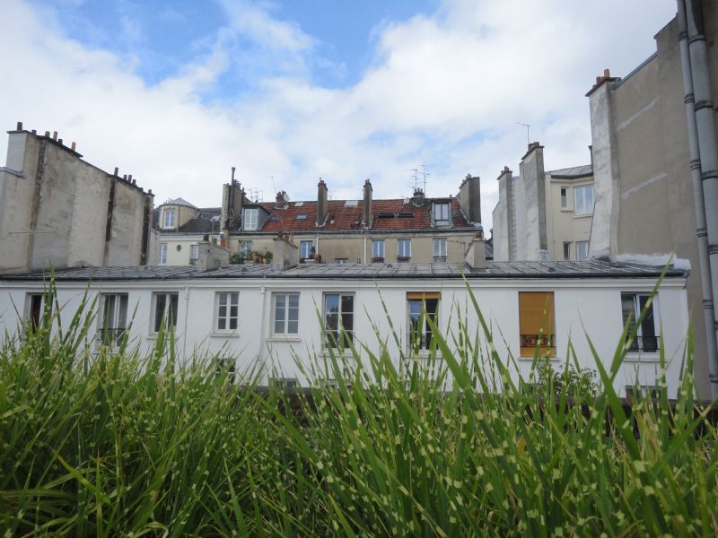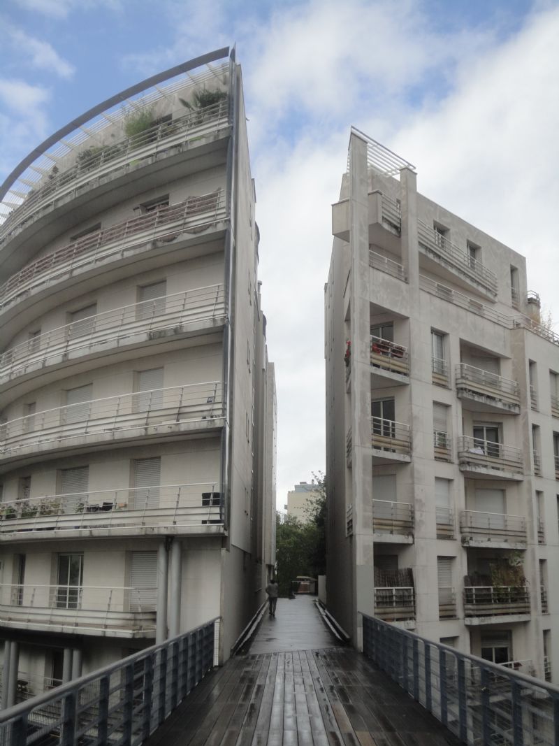 De Jardin de Reuilly, het middelpunt van gras, met een trillende hangbrug en met vele trappen naar de onderliggende avenue, brengt mijn peil op acht, negen meter. Nu mag ik snijden door woonblokken en flaneren langs oude daken. Het wordt een fenomenale tocht, hoog maar niet droog, met Parijs letterlijk aan mijn voeten. Dit is puur stedelijk genieten, in weer en wind en weeral bijna moederziel alleen. Hier komt blijkbaar geen hond, tenzij aan een leiband. De regen gniffelt, vermoed ik.