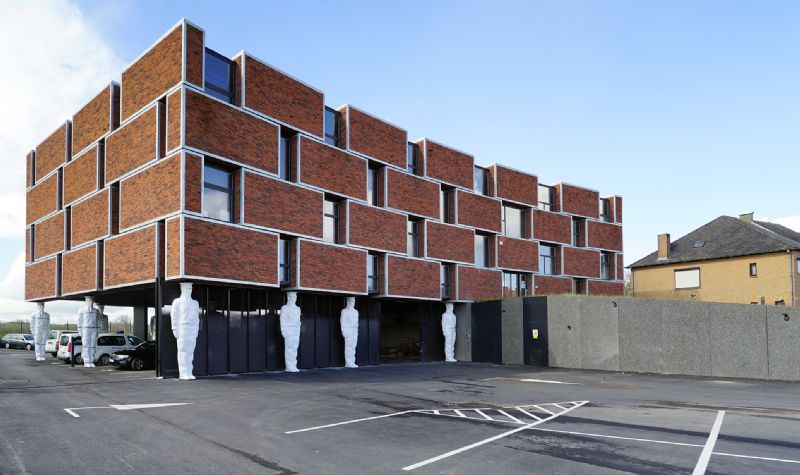 Ik rijd wel eens met de auto tussen pakweg Ninove en Oudenaarde en zo bots ik onlangs op een gebouw, dat plagerig in je gezicht lacht. Wat is dàt? Het straatbeeld wordt eigenlijk gevormd door drie componenten. Primo, een imposante trap met hellend vlak richting de ingang. Zo wordt langs een bescheiden provinciale weg reeds een stevig statement gemaakt. Secundo, een ingenieus spel van strak omrande metselwerkvlakken en glaspartijen, zoals dozen maar outside the box. Last but not least, dertien kariatiden op het gelijkvloers. En welke kariatiden! 3,60 meter hoge kunststoffen flikken met een kepie op hun hoofden, die het gebouw letterlijk boven de parking tillen. De architecten, die de opdracht aan een Open Oproep van de Vlaamse Bouwmeester danken, noemen zelf deze hoogglanzende agenten “androgyn”. Niemand denkt hier alvast aan die ongevaarlijke plastieken reuzenkonijnen maar wel aan strakke leatherboys met een overdosis aan macho-looks, die zo uit de fantasie van Jean-Paul Gaultier, zelfs van Jean Genet kunnen gesprongen zijn. En dat alles uitgerekend voor een politiecommisariaat. In Brakel. Il faut le faire.