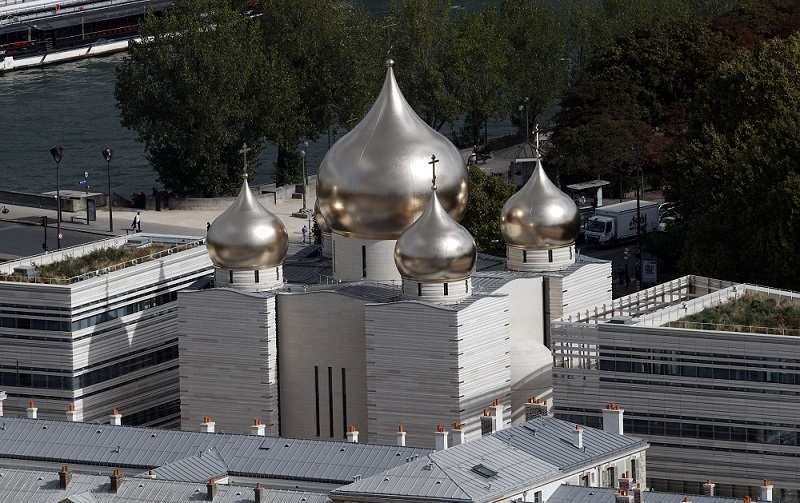 Nu de pope. Achter het Branlymuseum van weeral Nouvel prikken vijf reusachtige zilveren blinkende ronde koepels inclusief een enorm kruis op mijn netvlies. Ze rusten op een zandstenen massief met vier torens dat omkraagd wordt door horizontaal gelamelleerde gebouwen. Het lijkt wel een dorp aan de Almabrug over de Seine. Aan een druk fotograferende man vraag ik wat dit allemaal betekent en hij zegt: “Russia. Church. School.” Na deze steno zoek ik op wat die laag bij de grondse diefstal van wat Torre Agbar (Nouvel³) hier en wat Burgo Tower (Souto) daar moet voorstellen en waarempel, daar staat een kathedraal met school en cultureel centrum van Russisch-orthodoxe kunne. Bedenker is een zekere Jean-Michel Wilmotte, kostprijs een nog meer zekere 100 miljoen euro. Opnieuw een dure vergissing dus maar wel met venijn in de staart. Dezelfde dag lees ik op een nieuwssite dat de patriarch niet naar Parijs komt om de kathedraal in te wijden omdat opperpope Poetin, de eregast, ook niet wil komen gezien hij kwaad is op Hollande. Die zou stoute dingen gezegd hebben over Rusland in Syrië. Dan ook maar geen Rusland in Parijs. Dit hedendaagse Speergebouw mag ondertussen gewoon stoer doen. Paris ne rit plus.
