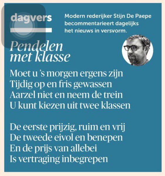 De Morgen, langzaam maar zeker ontaardend in Het Laatste Nieuws voor hoogopgeleiden, -geplaatsten en -ophebbers, brengt ons sinds een half jaar ook iets van zichzelf in de vorm van een nog straffere gast, dagelijks op de linkeronderhoek van bladzijde twee. Stijn De Paepe laat zich een moderne rederijker noemen en van dat epitheton wordt eigenlijk geen enkele letter gelogen. Wie elk etmaal een schamper schotschrift uit de actualiteit kan persen, met een onvoltroffen rijmschema, een rijke klankkleur, een gevatte woordenschat en bovenal een rake inhoud binnen een strak metrum, die verdient een welgemeende schouderklop. Je zou er zelfs speciaal de krant voor kopen. Ik citeer graag zijn ‘Pendelen met klasse’ van 4 januari 2017: