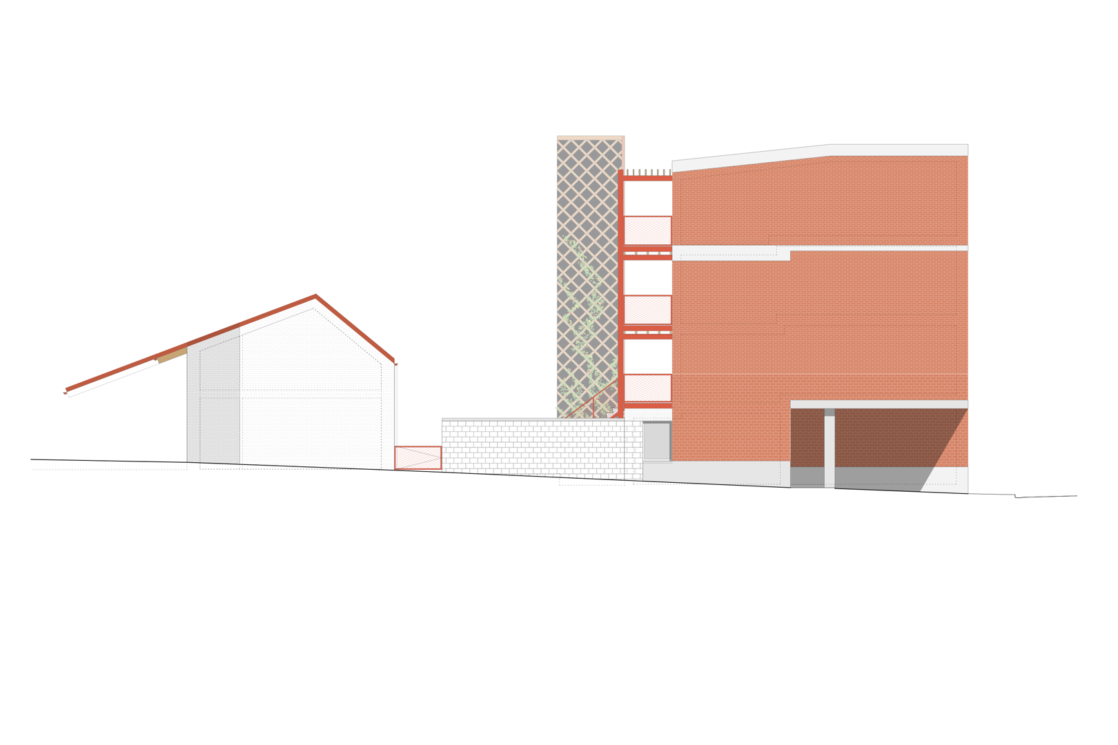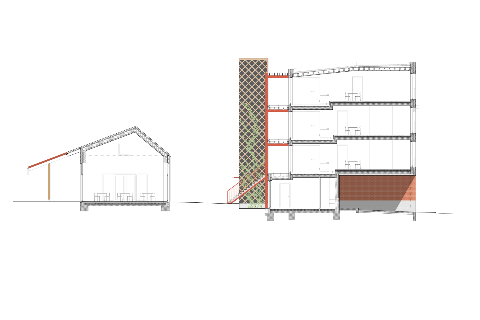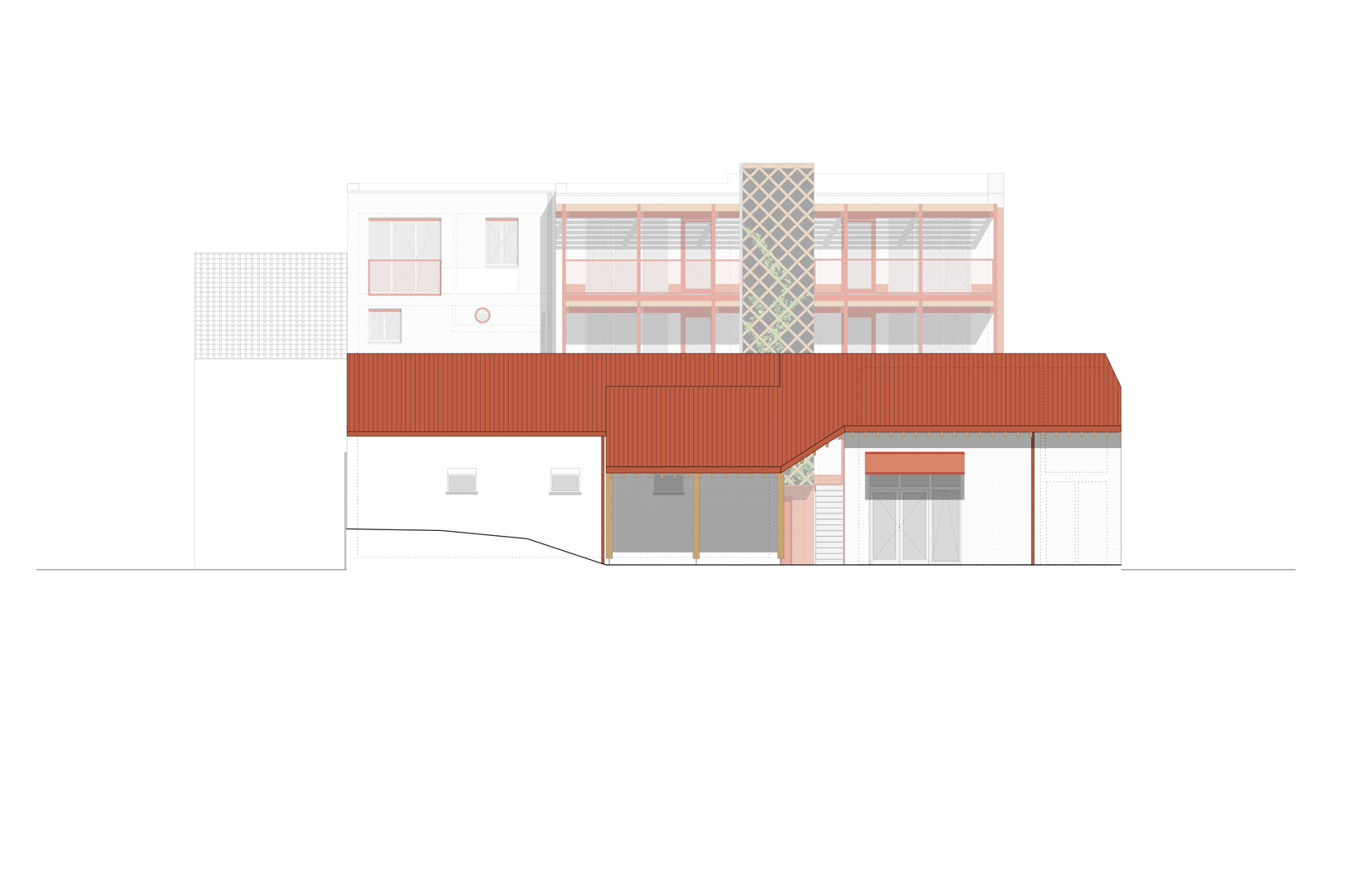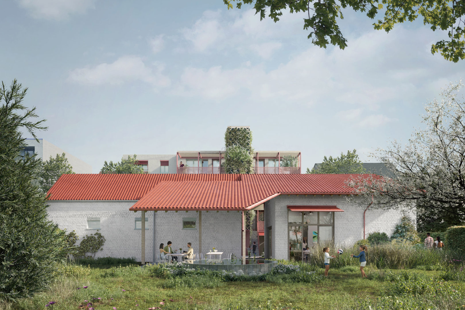Ook het erf en de tuin krijgen een nieuwe invulling met respect voor het bestaande. Enkele achterbouwen worden afgebroken, maar een karaktervolle schuur blijft behouden en krijgt een tweede leven als fietsenstalling, atelier en bergzolder. Centraal op de site komt een nieuwe tuinkamer, opgetrokken in gerecupereerde gevelstenen, die dienstdoet als collectieve keuken en eetruimte. Een brede doorgang tussen de gebouwen leidt naar een overdekt terras dat de tuin ontsluit en de tuinkamer verbindt met het groen. Zo ontstaat een sequentie van ruimtes die het gemeenschapsleven versterkt en de ecologische en sociale ambities van Stek Future tastbaar maakt.
