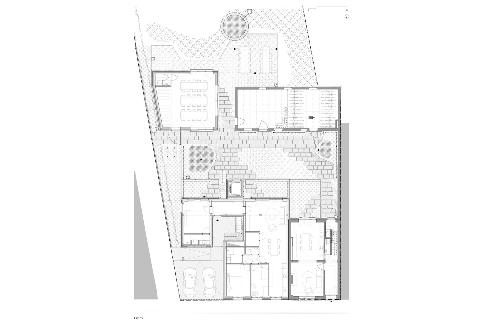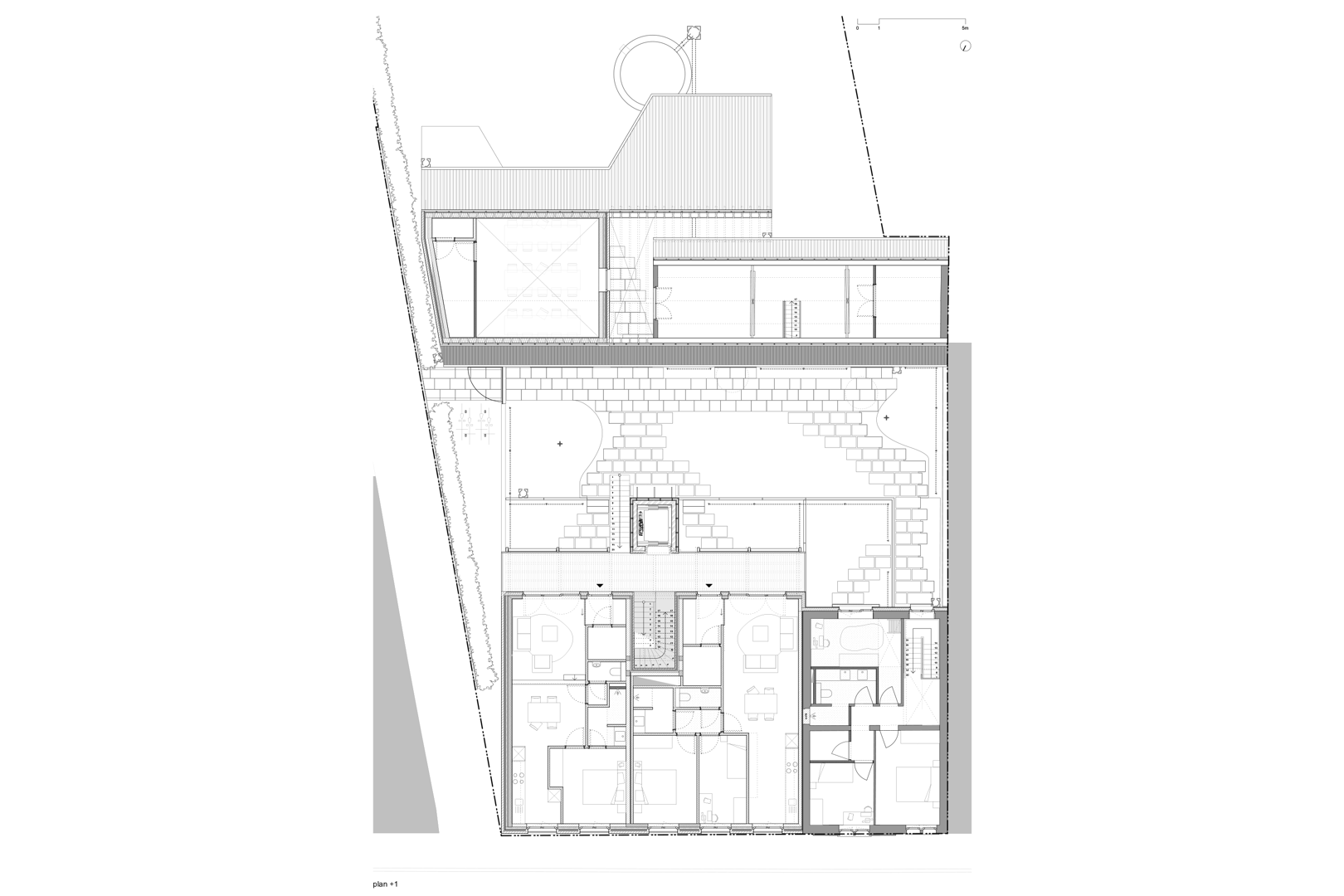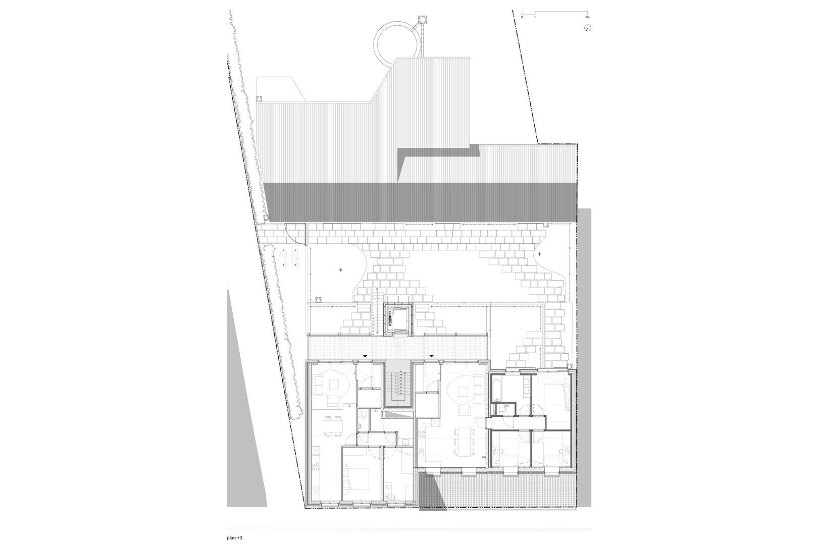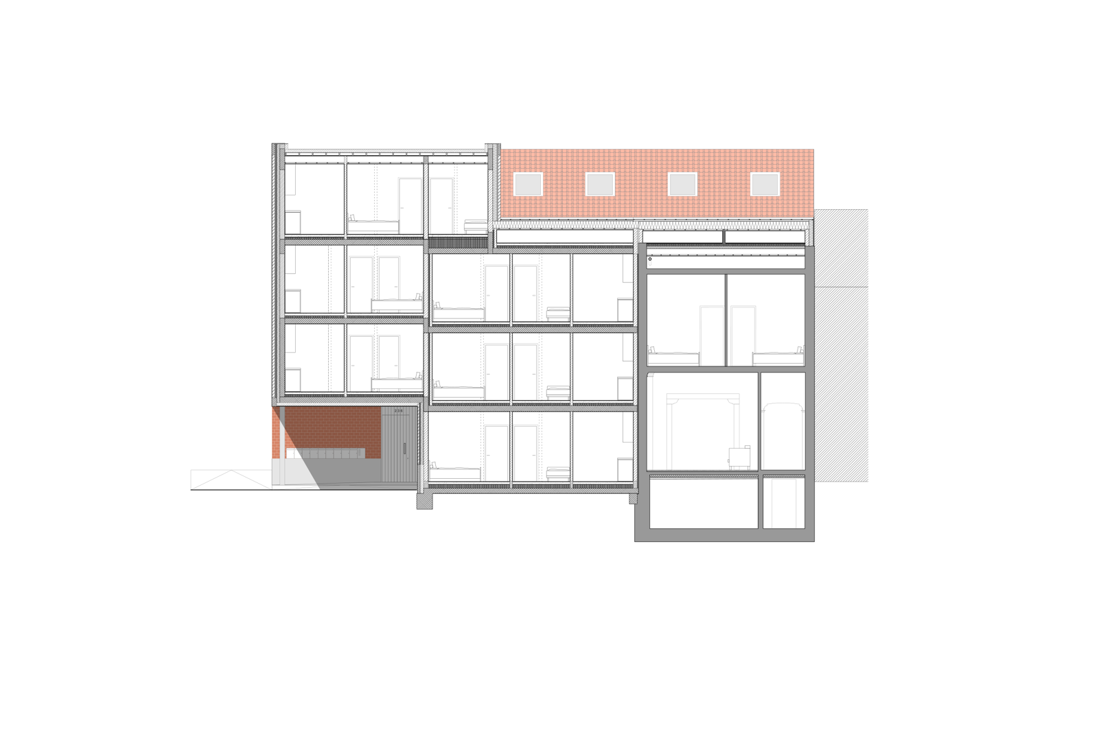 Ook het erf en de tuin krijgen een nieuwe invulling met respect voor het bestaande. Enkele achterbouwen worden afgebroken, maar een karaktervolle schuur blijft behouden en krijgt een tweede leven als fietsenstalling, atelier en bergzolder. Centraal op de site komt een nieuwe tuinkamer, opgetrokken in gerecupereerde gevelstenen, die dienstdoet als collectieve keuken en eetruimte. Een brede doorgang tussen de gebouwen leidt naar een overdekt terras dat de tuin ontsluit en de tuinkamer verbindt met het groen. Zo ontstaat een sequentie van ruimtes die het gemeenschapsleven versterkt en de ecologische en sociale ambities van Stek Future tastbaar maakt.
