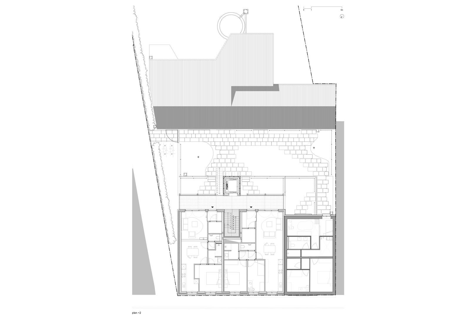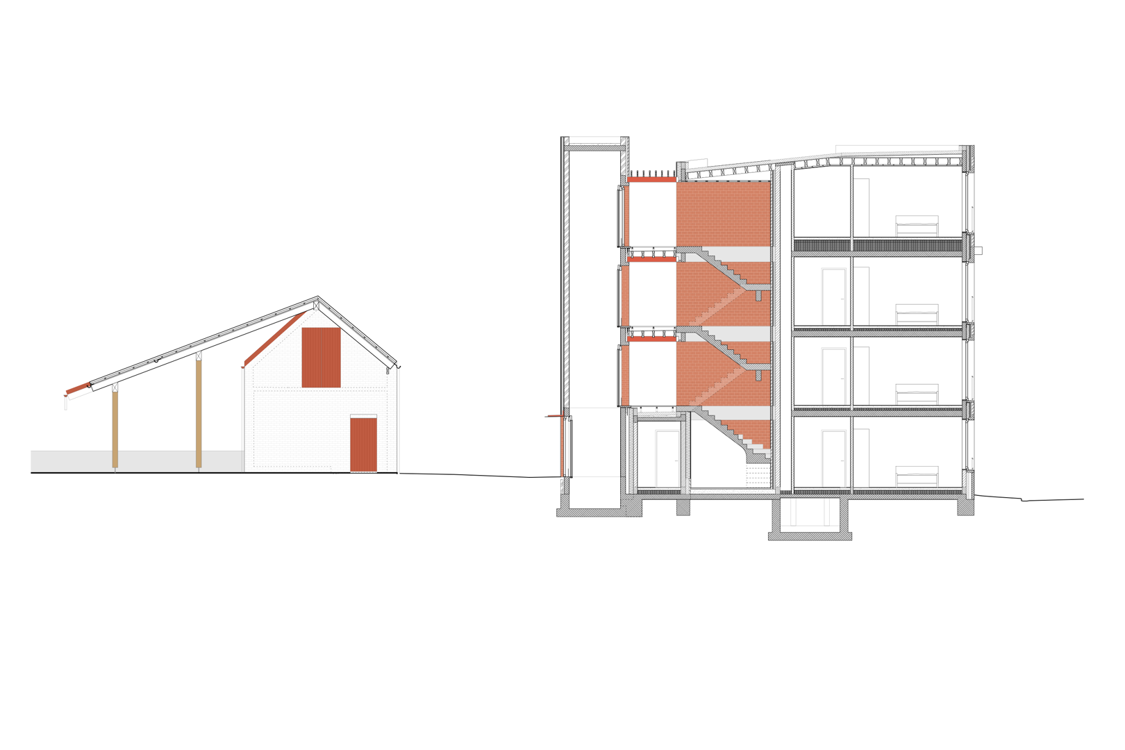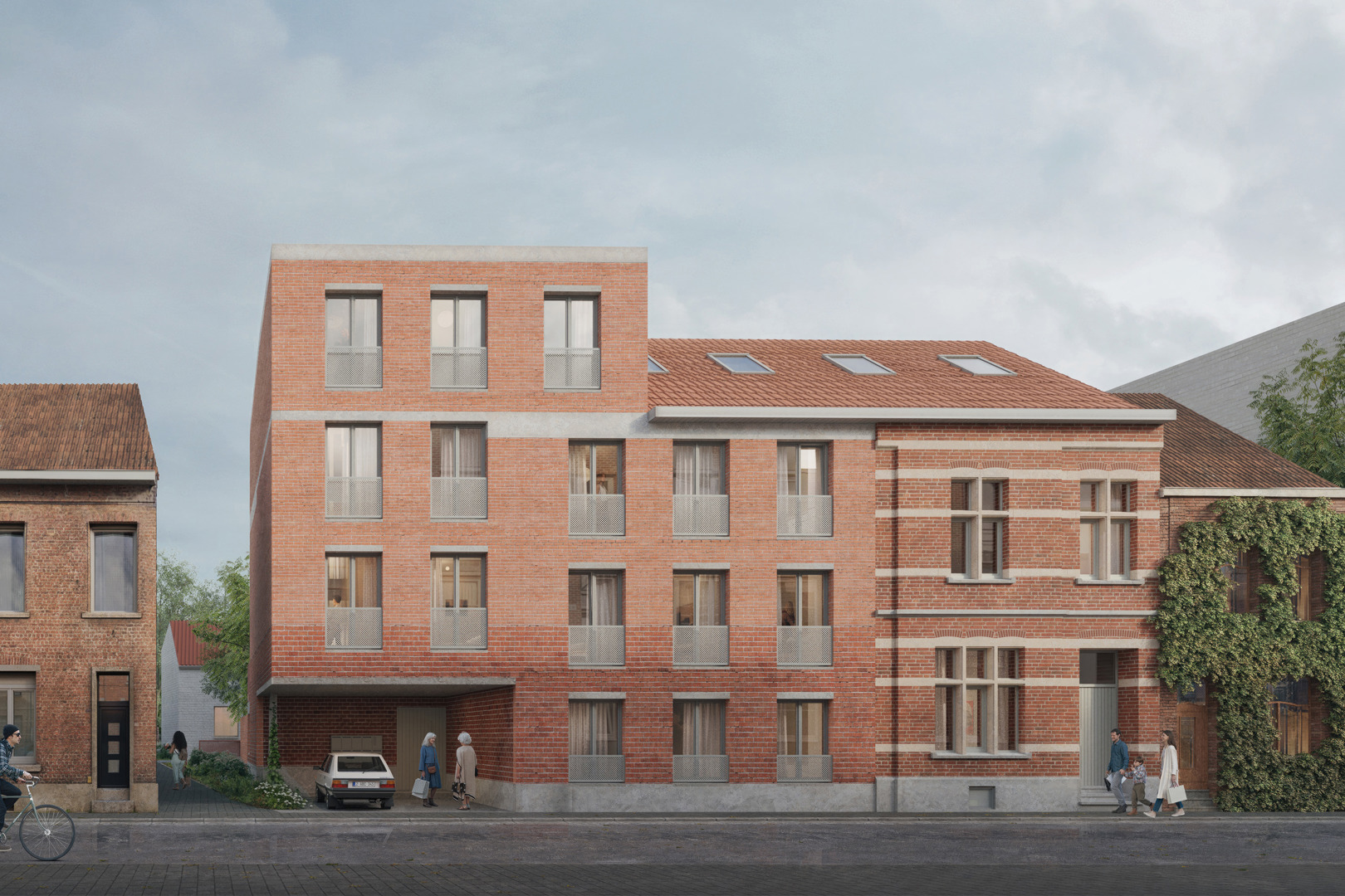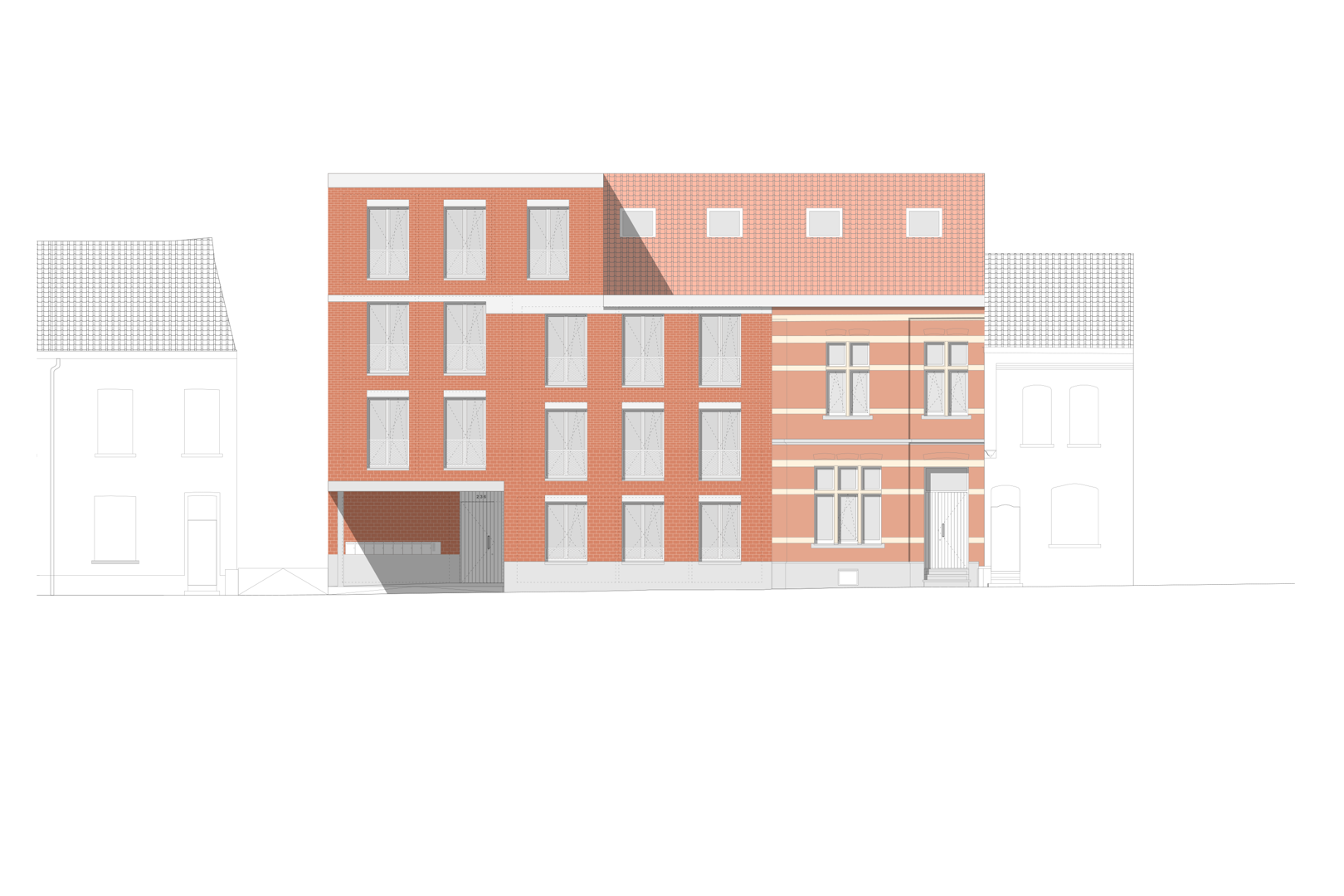 De architectuur van ectv houdt rekening met de schaal en materialiteit van de plek. De rijwoning aan de westzijde wordt aangevuld met een nieuwbouwvolume dat het bestaande gabarit volgt, zodat oud en nieuw samen een nieuwe eenheid vormen. Alle woningen zijn gepositioneerd tussen straat en erf, en krijgen een open doorzonkarakter dat inspeelt op lichtinval en zichtlijnen. De overgang van publiek naar gedeeld en privaat wordt zorgvuldig geënsceneerd, met aandacht voor informele ontmoetingen en collectief gebruik. ectv tekende ook het ontwerp voor een ander coöperatief woonproject, in de wijk Heulebrug in Knokke-Heist, en brengt ook hier die ervaring mee in de verfijnde balans tussen individueel wonen en gedeeld leven.