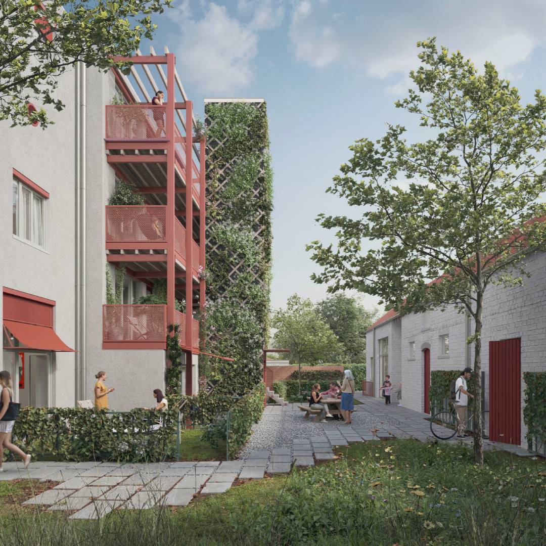 In de Gemeentestraat in Kessel-Lo verrijst binnenkort Stek Future: het eerste coöperatieve woonproject van wooncoop in Leuven. Op een terrein met een oude erfstructuur, met woningen, bijgebouwen en een grote achterliggende tuin, ontwierp ectv architecten een cohousingproject met acht woonentiteiten en een gedeeld programma. Het ontwerp vertrekt vanuit de bestaande structuur van straat, erf en tuin, en vertaalt die logica in een nieuwe ruimtelijke samenhang. De bestaande rijwoning aan de straat wordt behouden en vormt samen met een nieuw volume een markante hoek aan het Toekomstpad. De omgevingsvergunning voor het project is afgeleverd en de afbraakwerken zijn inmiddels gestart.