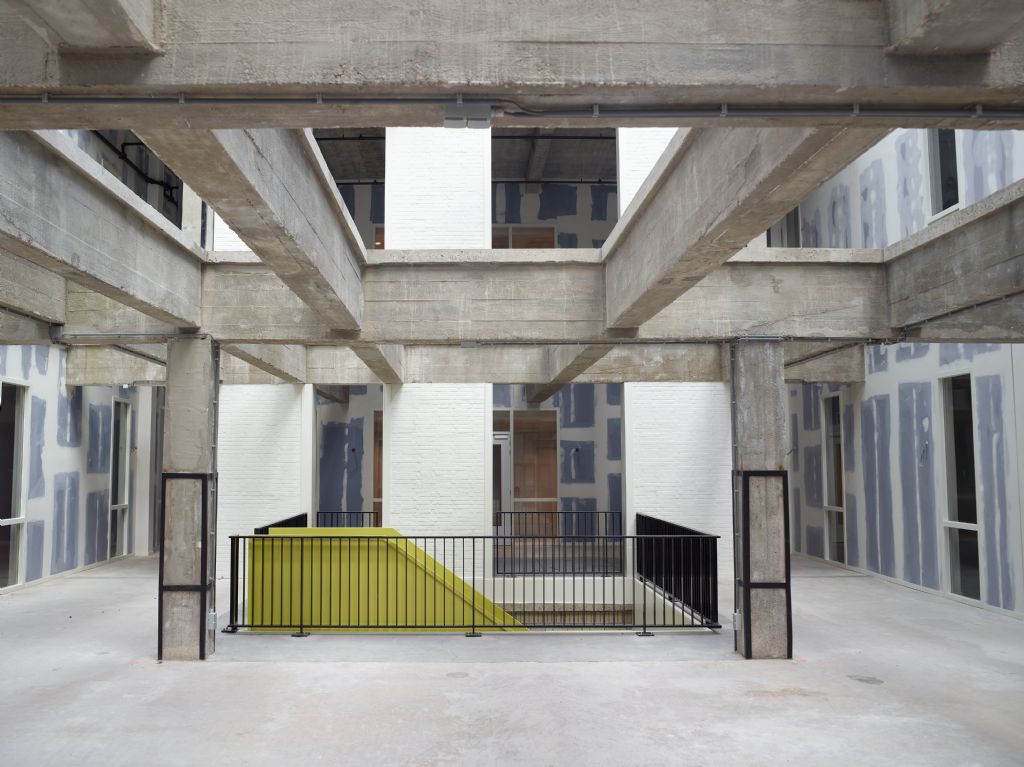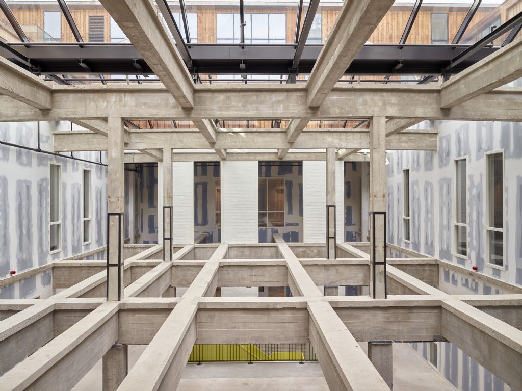 Op het bestaande gebouw zijn twee verdiepingen toegevoegd van staal en houtskeletbouw. Beiden verdiepingen situeren zich rondom een buitenruimte waarin zich de lichtstraten van het ondergelegen atrium bevinden. Het atrium is gemaakt door een aantal velden van de verdiepingsvloeren en oude dakvloer uit te zagen. Doorheen de bewaarde structuur van kolommen en balken, dringt licht loodrecht tot op de begane grond door. Andersom is er vanuit het atrium een zicht op de omliggende hoogbouw.