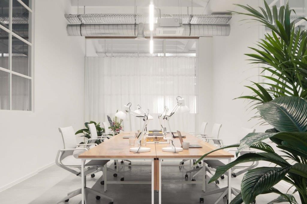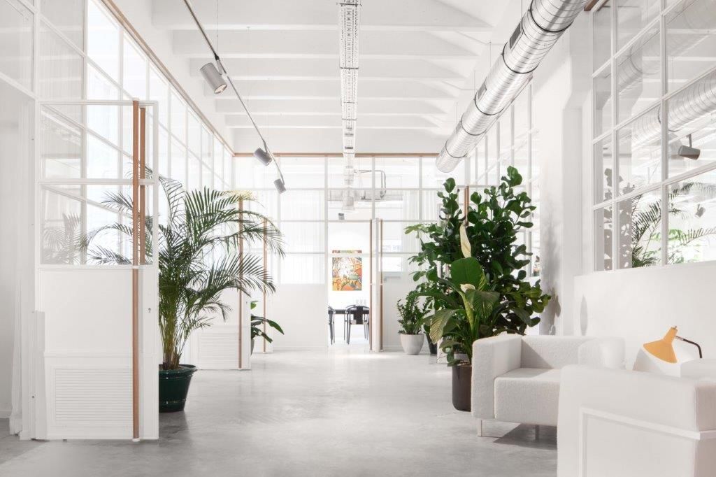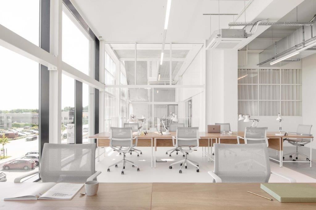 Binnen in het gebouw is de meest in het oog springende ruimte de hippe coworkingspace van Fosbury & Sons, die de eerste en tweede verdieping inneemt. KRAS architecten werkte de interieurvormgeving uit in samenwerking met Going East, dat niet aan zijn proefstuk toe was. “We hebben de stevige betonkolomstructuur van het voormalige opslaggebouw en de hoge plafonds in betonnen TT-liggers bewust in het zicht gelaten. De coworkingspace is geraffineerd opgedeeld in afzonderlijk verhuurbare kantoorruimtes met gedeelde vergader- en ontspanningsfaciliteiten. De scheidingswanden – in de vorm van slanke witgelakte stalen frames op een borstwering in baksteen – zijn onderaan ingevuld met een laag gehamerd glas en bovenaan met transparant glas. De inrichting laat zich omschrijven als fris wit met warme accenten, gecombineerd met specifieke hedendaagse kunstinstallaties die de gezelligheid van ‘samen werken’ stijlvol benadrukken. Dit alles resulteert in een aangename, huiselijke setting.”